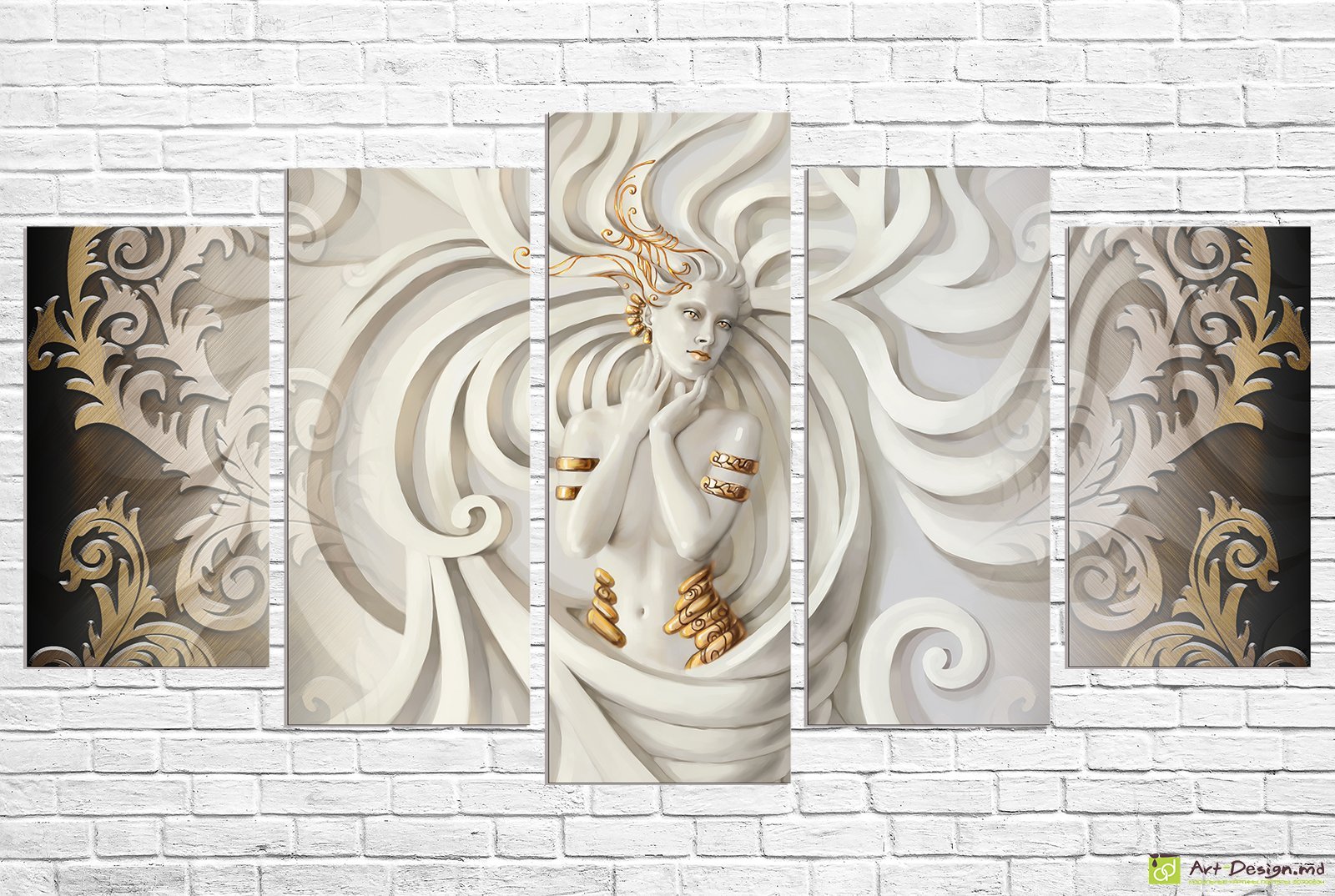 Модульная картина «Арт-деко богиня» сочетает элегантность классического искусства и современный декоративный стиль. Центральный элемент композиции — изящная женская фигура, выполненная в стилистике арт-деко и окружённая плавными линиями и орнаментами. Золотые детали подчёркивают утончённость образа и придают композиции ощущение роскоши.