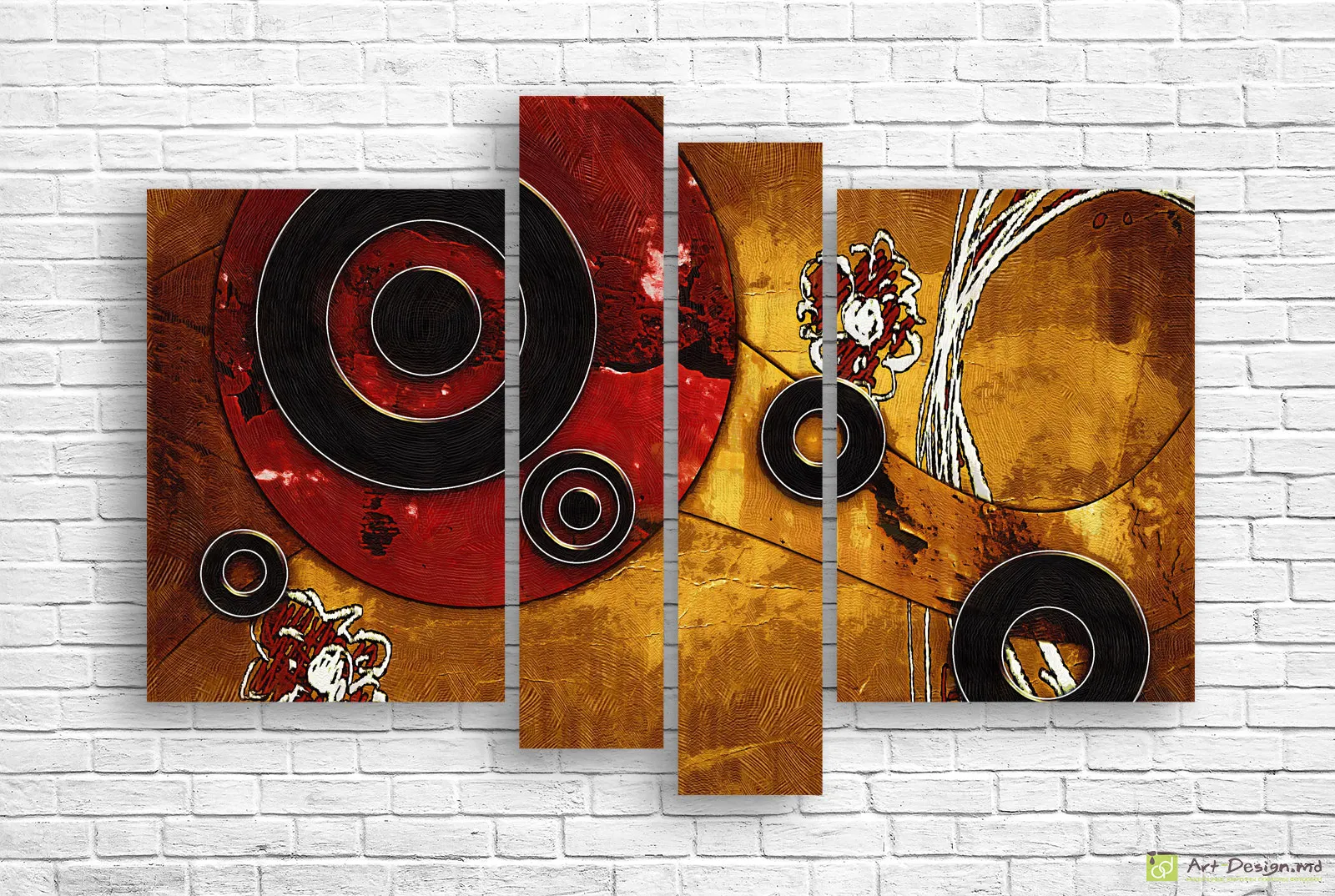 Модульная картина в абстрактно-геометрическом стиле построена на контрасте золотистых и тёмных оттенков с выразительными круглыми формами. Глубокие текстуры, плавные линии и многослойная композиция создают ощущение ритма и гармонии, привлекая внимание и добавляя интерьеру художественную глубину.