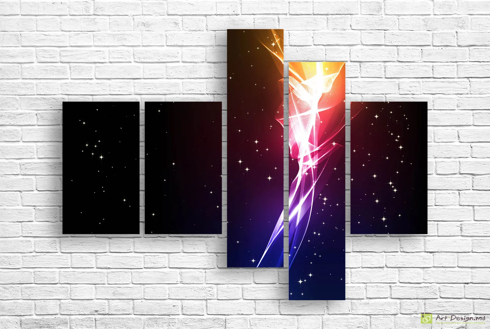 Модульная картина построена на контрасте тёмного фона и мягких световых линий, напоминающих звёздный поток в ночном пространстве. Плавные переходы от глубоких синих и фиолетовых оттенков к тёплым золотистым акцентам создают ощущение глубины, воздуха и спокойного движения.