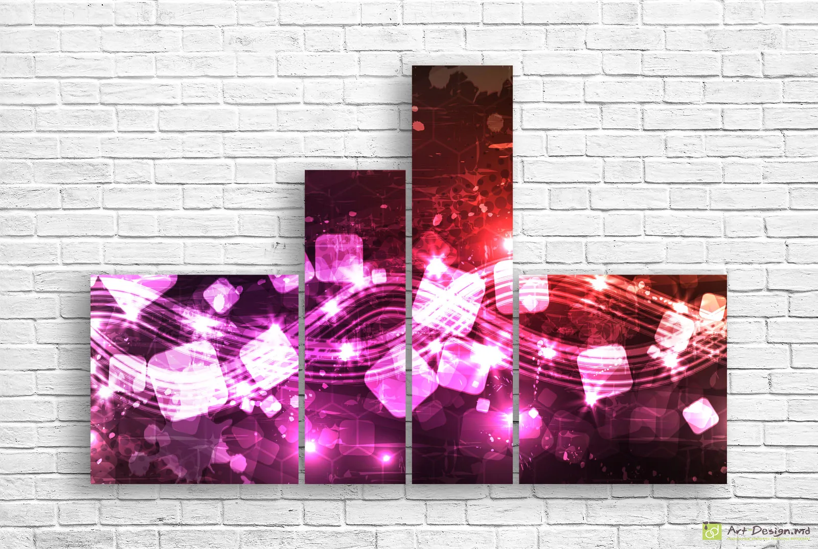 Модульная картина выполнена в динамичном абстрактном стиле, где световые волны и мерцающие формы создают ощущение энергии и непрерывного движения. Яркие розовые и малиновые оттенки переплетаются с глубокими тёмными фонами, формируя выразительную и эмоциональную композицию.