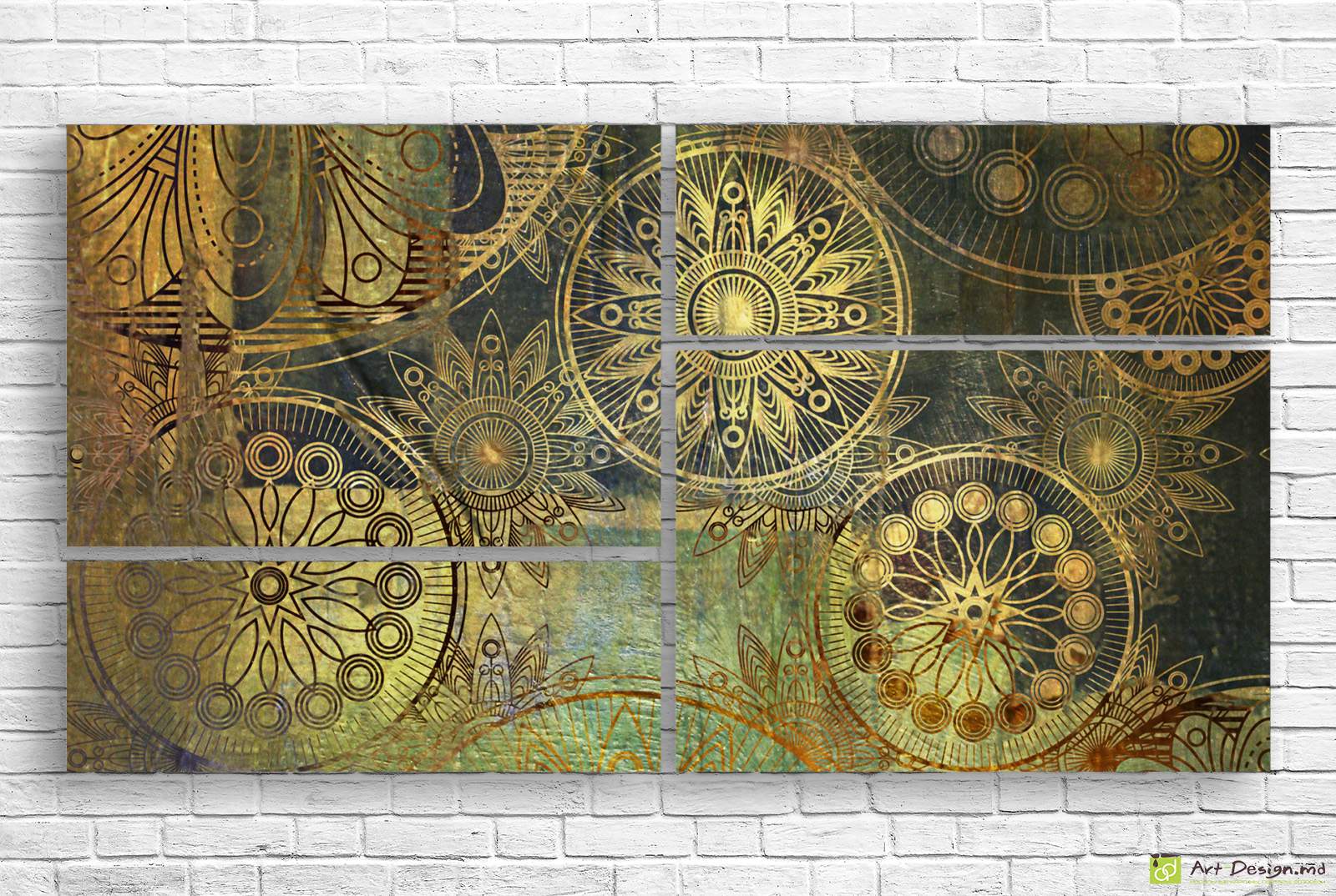 Модульная картина выполнена в изысканном абстрактном стиле с использованием орнаментов, напоминающих мандалы и декоративные солнечные символы. Золотистые линии и сложные геометрические узоры гармонично переплетаются с приглушённым фоном зелёных, бронзовых и тёплых коричневых оттенков.