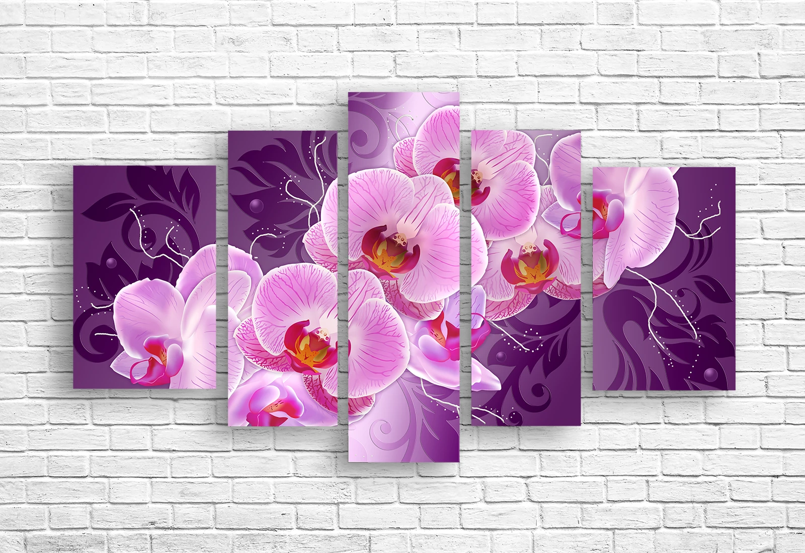 Модульная картина с розовыми орхидеями выполнена в формате полиптиха и состоит из пяти панелей, образующих цельную композицию. Картина на холсте передаёт выразительные оттенки лепестков, плавные линии цветов и декоративный фон, создавая яркий визуальный акцент.