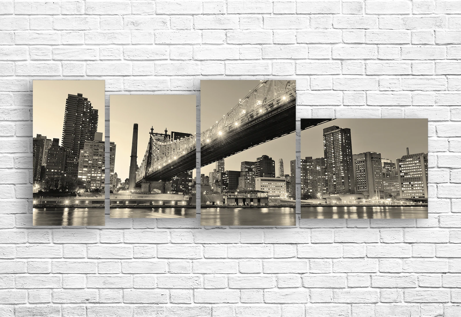 Эта атмосферная модульная картина переносит зрителя в сердце мегаполиса, запечатлевая величие моста Квинсборо на фоне ночных небоскребов. Выполненная в благородных тонах сепии, композиция придает интерьеру винтажный шарм и солидность. Огни города, отражающиеся в темной воде реки, создают уютное свечение, которое оживляет пространство. Четыре вертикальных сегмента разной высоты формируют панорамный вид, визуально расширяя границы комнаты и добавляя ей глубину.