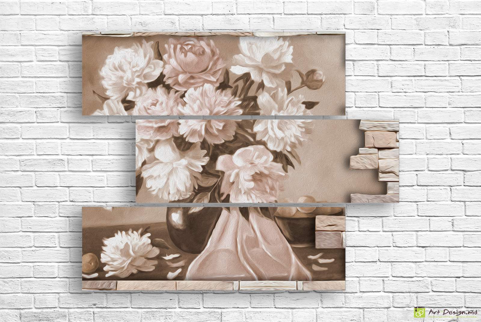 Модульная композиция с цветами в мягкой палитре подчёркивает спокойный характер интерьера, создавая визуальный баланс и ощущение комфорта. Печать фото Кишинёв.