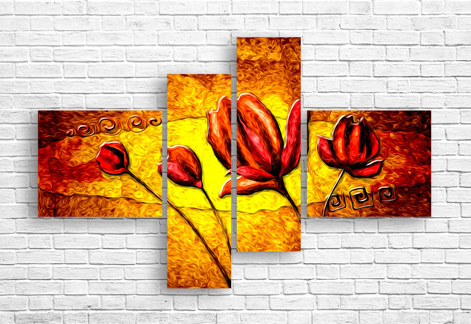 Модульная картина «Огненные маки» привлекает внимание насыщенными оттенками красного, жёлтого и оранжевого, создавая ощущение тепла и энергии. Абстрактная подача цветочных форм наполняет композицию динамикой и выразительностью.
