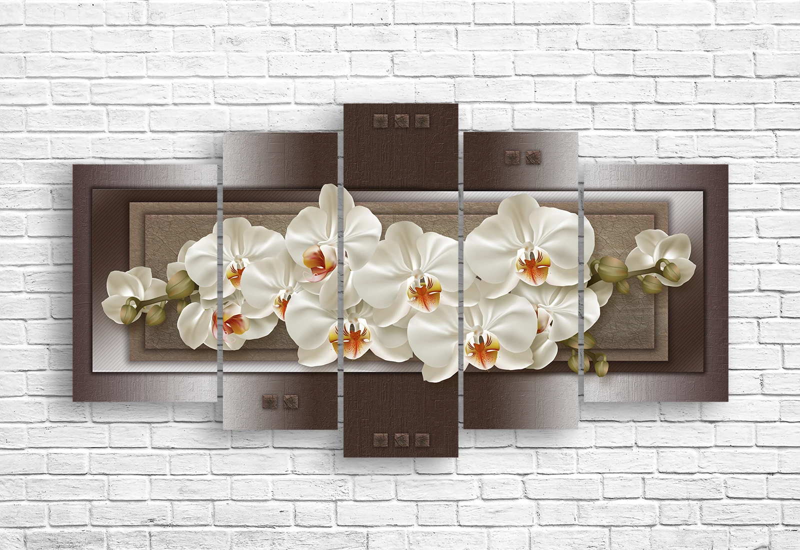 Модульная картина с белыми орхидеями выполнена в формате полиптиха и состоит из пяти частей. Цветочная композиция создаёт ощущение гармонии и визуального баланса, подчёркивая чистоту оттенков и плавные линии лепестков.
