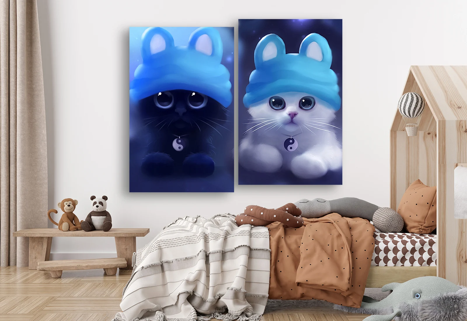Эта нежная модульная картина изображает двух очаровательных кошечек — одну белую и одну тёмную — в мягких голубых шапочках с забавными ушками. Их большие блестящие глаза, миниатюрные лапки и мягкое свечение фона создают тёплую, уютную и почти сказочную атмосферу.