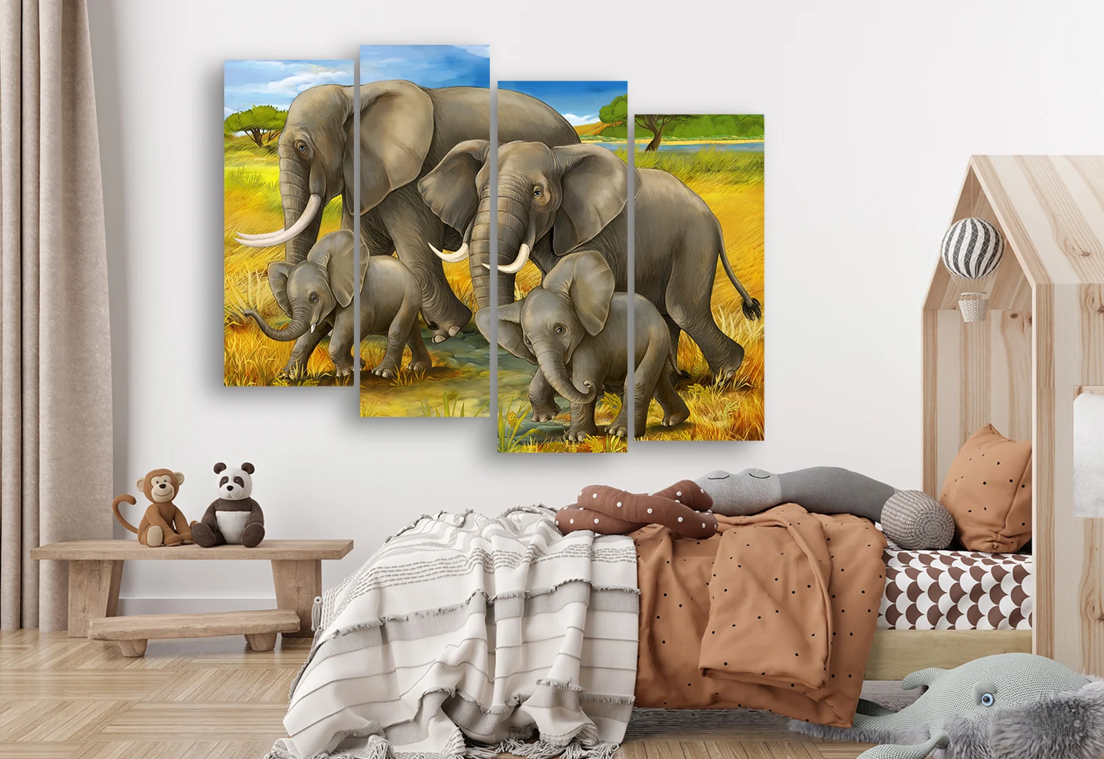 Эта модульная картина изображает тёплую и дружную семью слонов, путешествующих по солнечной саванне. Мягкая иллюстративная подача, плавные линии и нежные оттенки создают атмосферу спокойствия и доброты. Картина идеально подходит для оформления детской комнаты, добавляя в интерьер ощущение безопасности, заботы и природной гармонии.