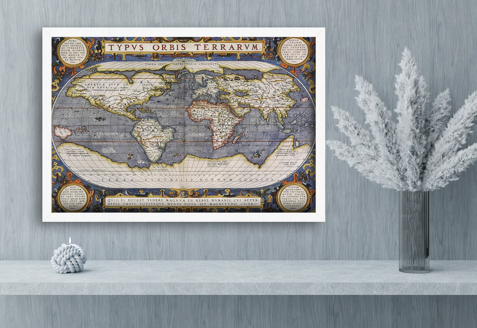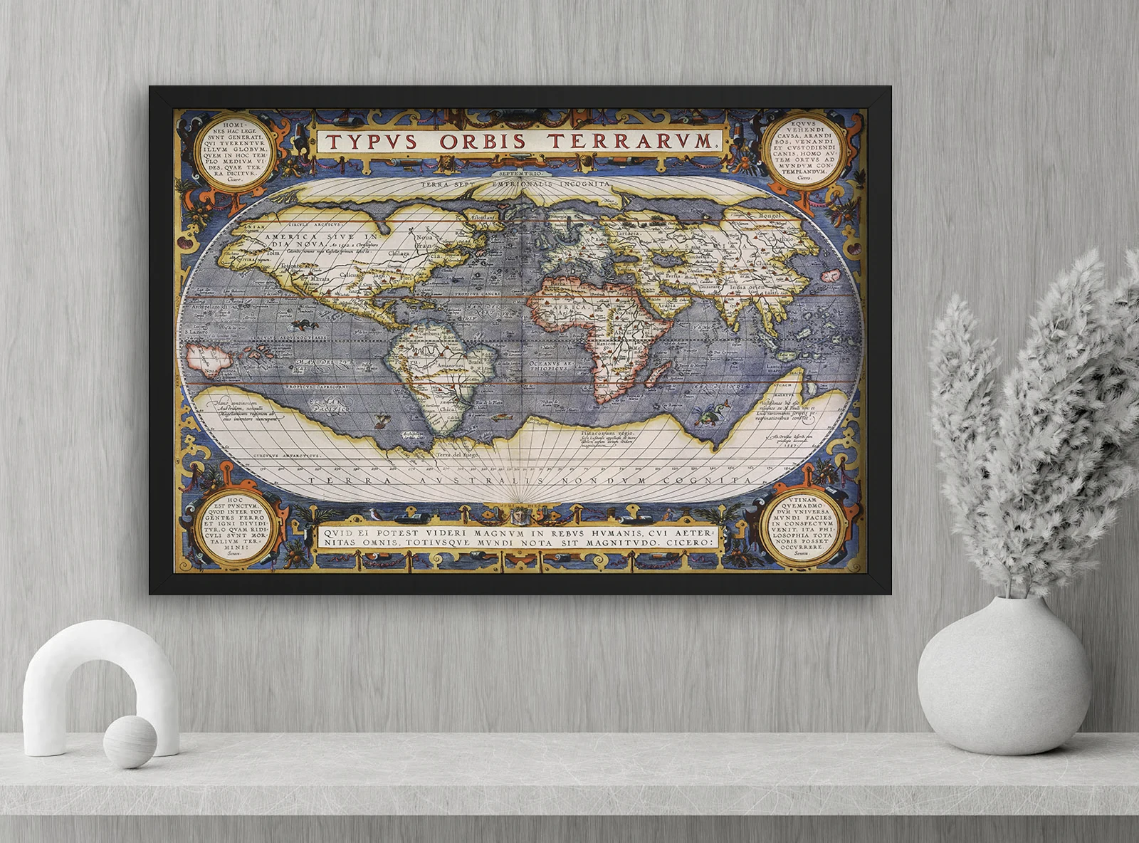 Эта карта мира в насыщенных винтажных оттенках придаёт интерьеру характер и глубину. Сложная детализация и историческая эстетика делают её идеальной для кабинета, офиса или библиотеки. Эффектно смотрится в белой раме, добавляя контрастности и чистоты композиции.
