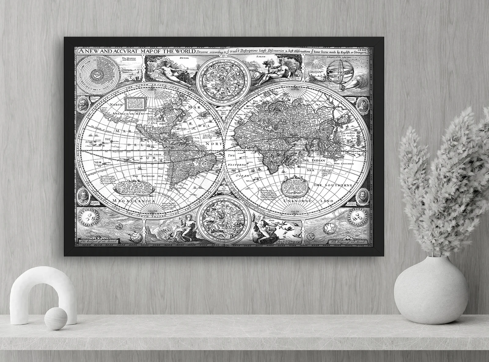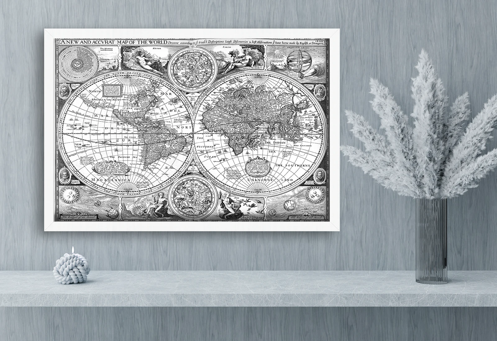 Эта изысканная карта мира выполнена в виде гравюры с детальной прорисовкой континентов и астрономических элементов. Белая рама подчеркивает историческую эстетику и делает постер идеальным выбором для библиотек, офисов или коллекционеров. Украшение с интеллектом и стилем.