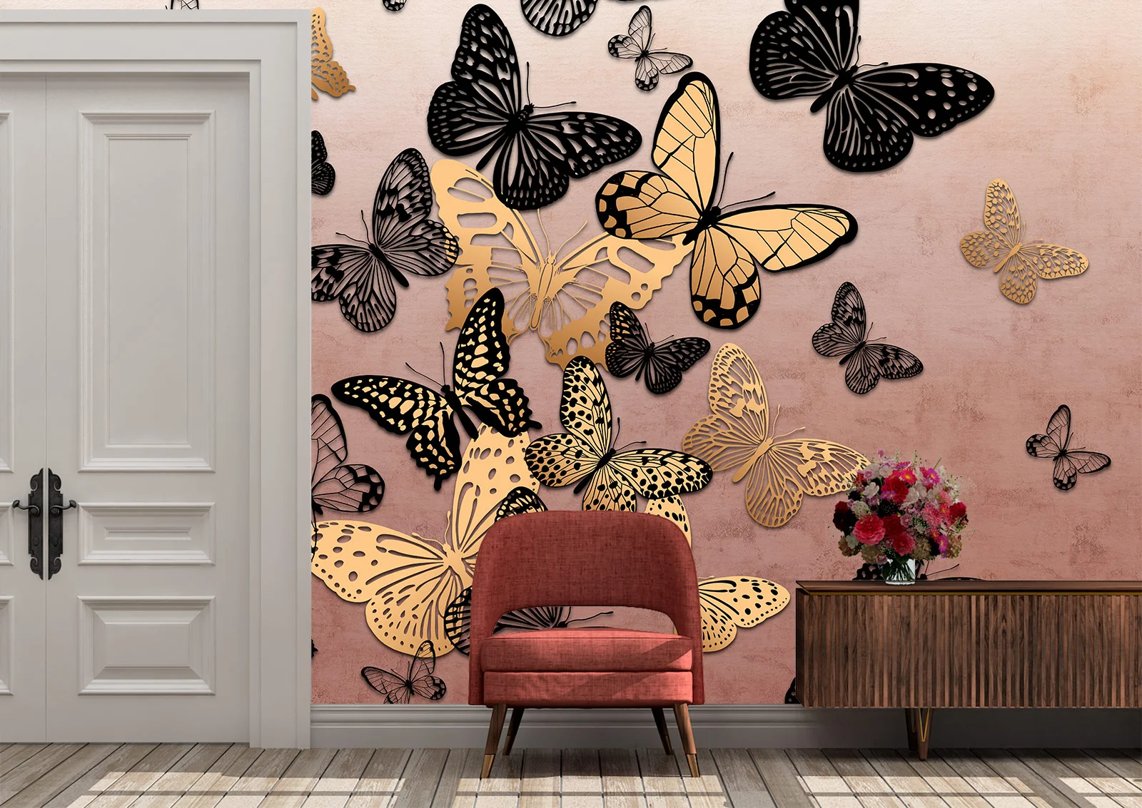 Эти роскошные фотообои с золотыми и чёрными бабочками наполняют пространство жизнью и изысканностью. Эффект 3D делает композицию особенно выразительной, словно бабочки вот-вот взлетят со стены. Идеально подойдут для гостиной, холла или креативного уголка. Добавьте шарма и индивидуальности вашему интерьеру с помощью декоративного акцента, который точно не останется незамеченным.