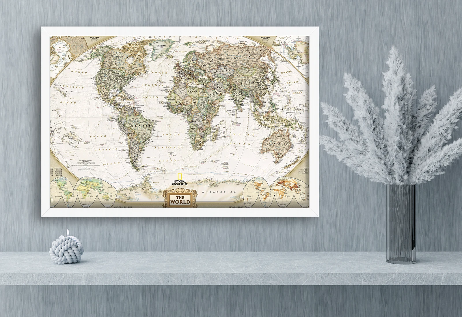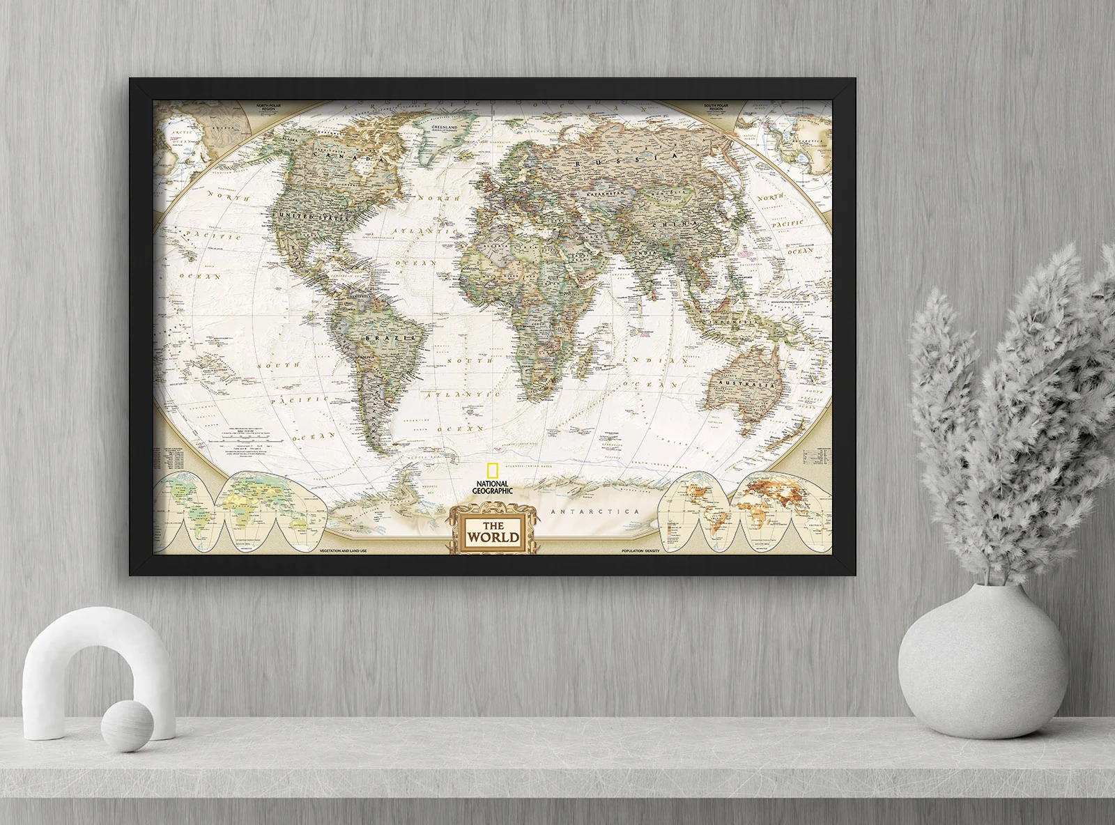 Стильная и точная карта мира от National Geographic в чёрной раме — идеальный постер для офиса, кабинета, учебных пространств и современных интерьеров.