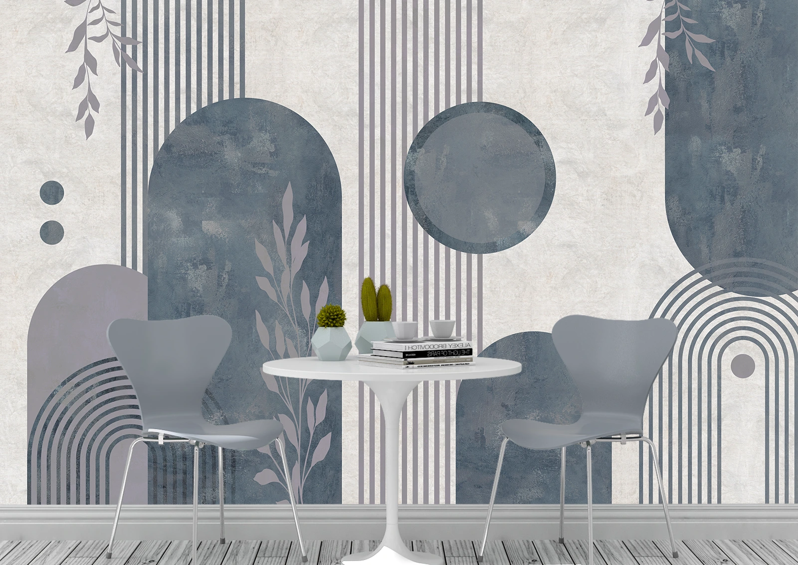 Геометрические фотообои в сине-серых тонах придают интерьеру свежесть и современный шарм. Абстрактные линии, круги и растительные элементы создают стильную композицию, идеально подходящую для кухни, столовой или кабинета. Выбирая фотообои с синими акцентами, можно достичь эффекта визуальной глубины и спокойствия в помещении.