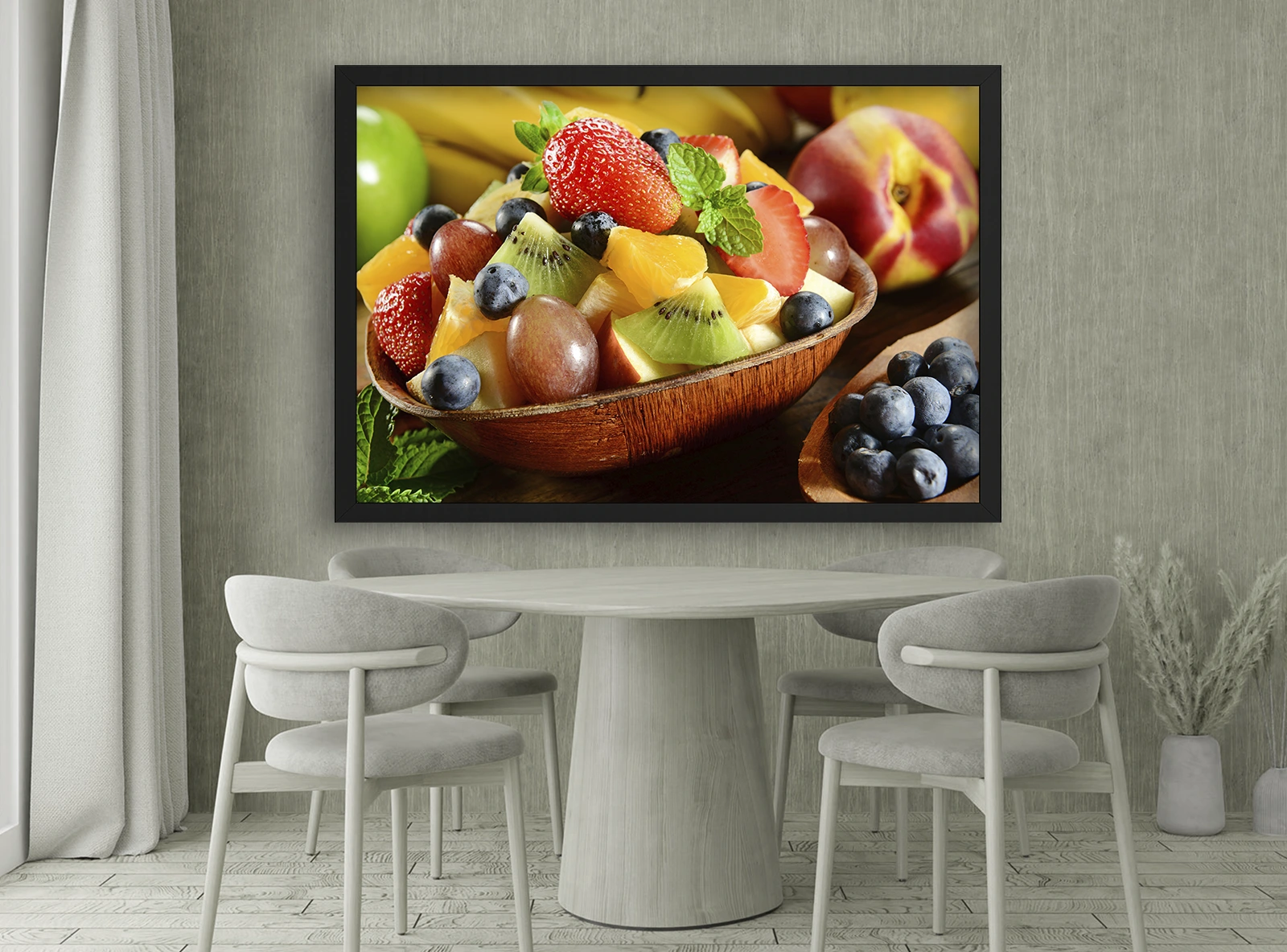 Картина с фруктами на кухне всегда создает праздничное настроение, добавляя яркие акценты в интерьер. В нашем ассортименте вы найдете постеры, которые идеально подойдут для декора кухни или столовой. Например, постер с изображением свежего фруктового салата, который включает апельсин, клубнику, чернику, киви и виноград. Этот вкусный натюрморт станет центром внимания в вашем интерьере.