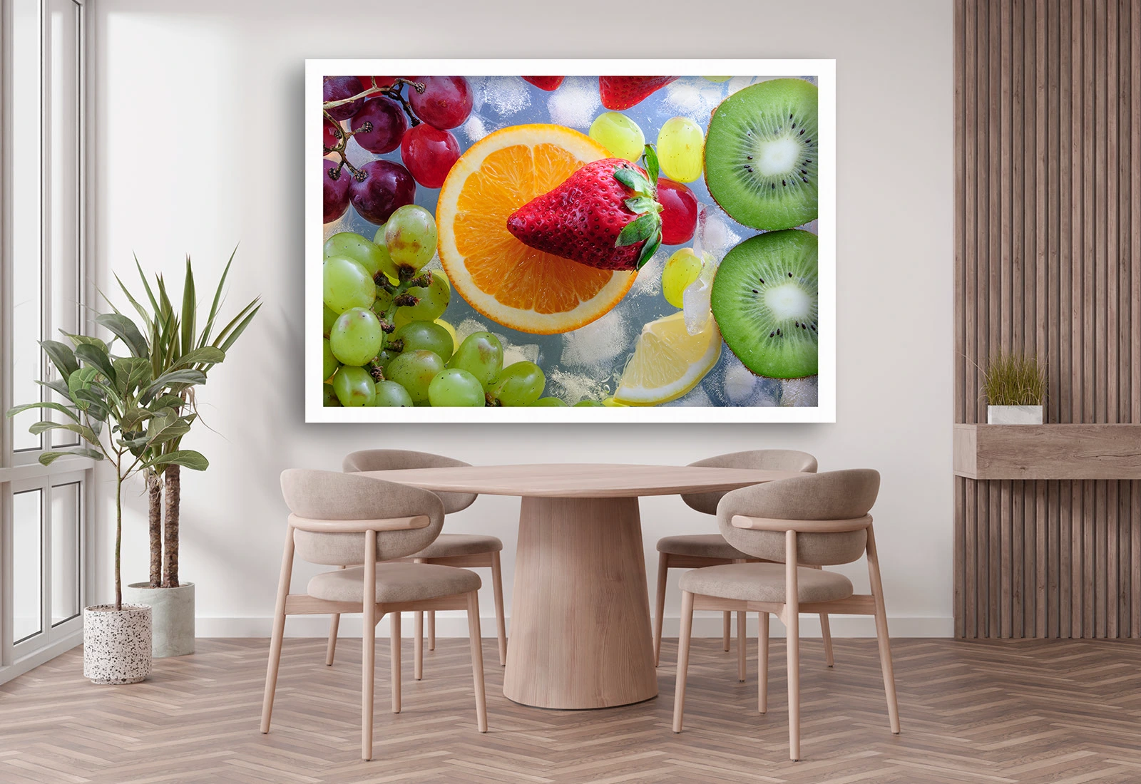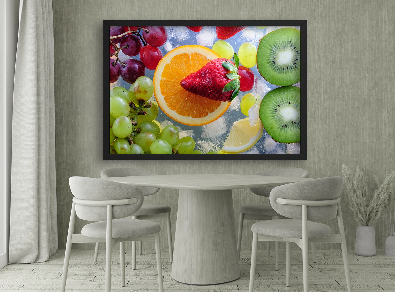 Π‘ΠΎΡΠ½ΡΠΉ ΠΈ ΠΊΡΠ°ΡΠΎΡΠ½ΡΠΉ ΠΏΠΎΡΡΠ΅Ρ Ρ ΠΈΠ·ΠΎΠ±ΡΠ°ΠΆΠ΅Π½ΠΈΠ΅ΠΌ ΠΊΠ»ΡΠ±Π½ΠΈΠΊΠΈ, ΠΊΠΈΠ²ΠΈ, Π°ΠΏΠ΅Π»ΡΡΠΈΠ½Π° ΠΈ Π²ΠΈΠ½ΠΎΠ³ΡΠ°Π΄Π° Π½Π° ΡΠΎΠ½Π΅ Π»ΡΠ΄Π°. ΠΠ΄Π΅Π°Π»ΡΠ½ΠΎΠ΅ ΡΠ΅ΡΠ΅Π½ΠΈΠ΅ Π΄Π»Ρ ΠΊΡΡ Π½ΠΈ, ΠΊΠ°ΡΠ΅ ΠΈΠ»ΠΈ ΡΡΡΠΊΡΠΎΠ²ΠΎΠ³ΠΎ ΠΌΠ°Π³Π°Π·ΠΈΠ½Π°. ΠΠ΅Π»Π°Ρ ΡΠ°ΠΌΠ° ΠΏΠΎΠ΄ΡΡΡΠΊΠΈΠ²Π°Π΅Ρ ΡΠ²Π΅ΠΆΠ΅ΡΡΡ ΠΈ ΡΡΠΊΠΎΡΡΡ ΠΊΠΎΠΌΠΏΠΎΠ·ΠΈΡΠΈΠΈ, ΠΏΡΠΈΠ΄Π°Π²Π°Ρ ΠΈΠ½ΡΠ΅ΡΡΠ΅ΡΡ Π»ΡΠ³ΠΊΠΎΡΡΡ ΠΈ Π±ΠΎΠ΄ΡΠΎΡΡΡ.
