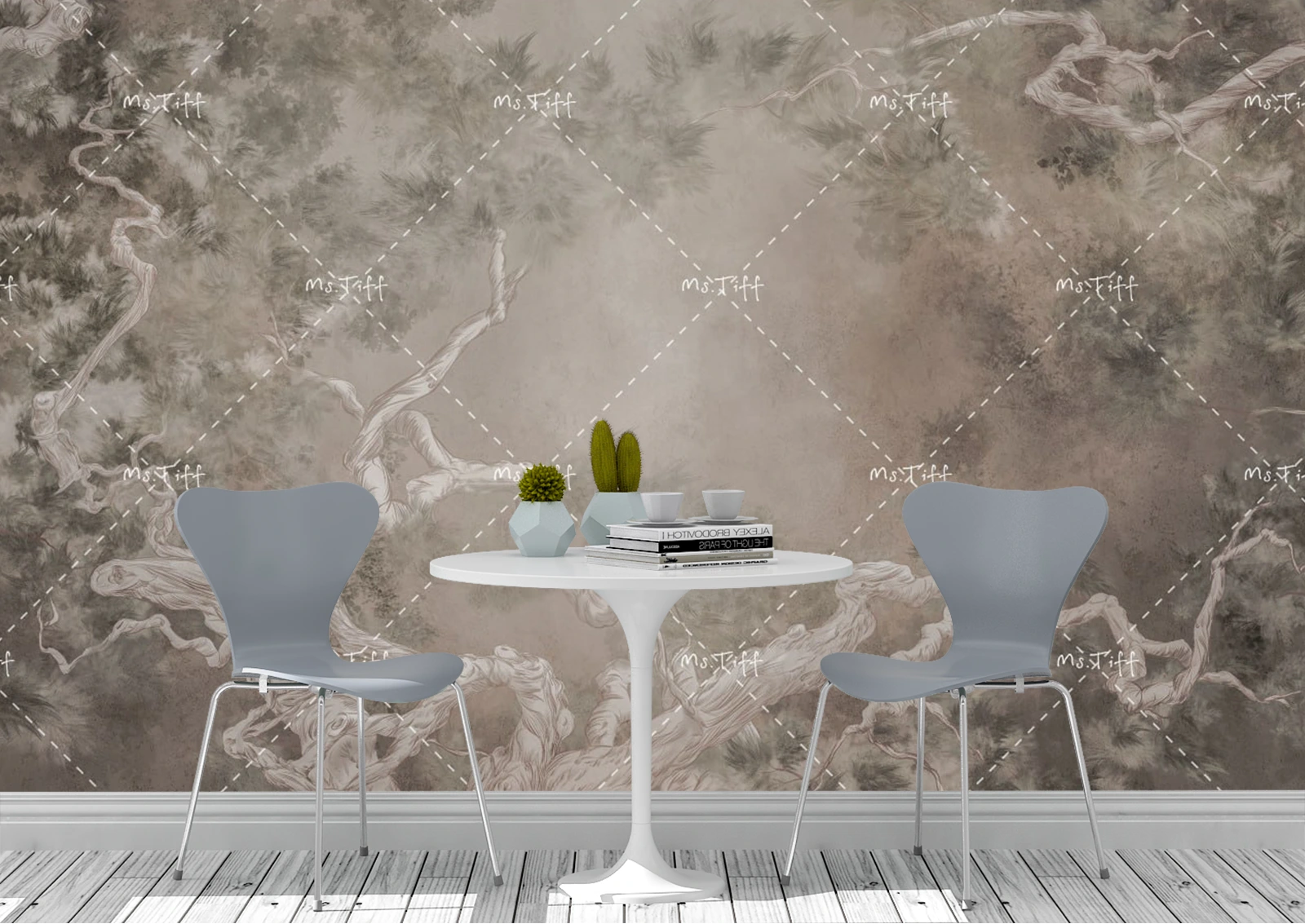Фотообои «Деревья в дымке» передают ощущение природной гармонии и мягкости. Плавные линии ветвей и приглушённые тона создают утончённую атмосферу уюта. Этот дизайн подходит для кухни, обеденной зоны или спальни, подчёркивая естественную красоту и спокойствие интерьера.