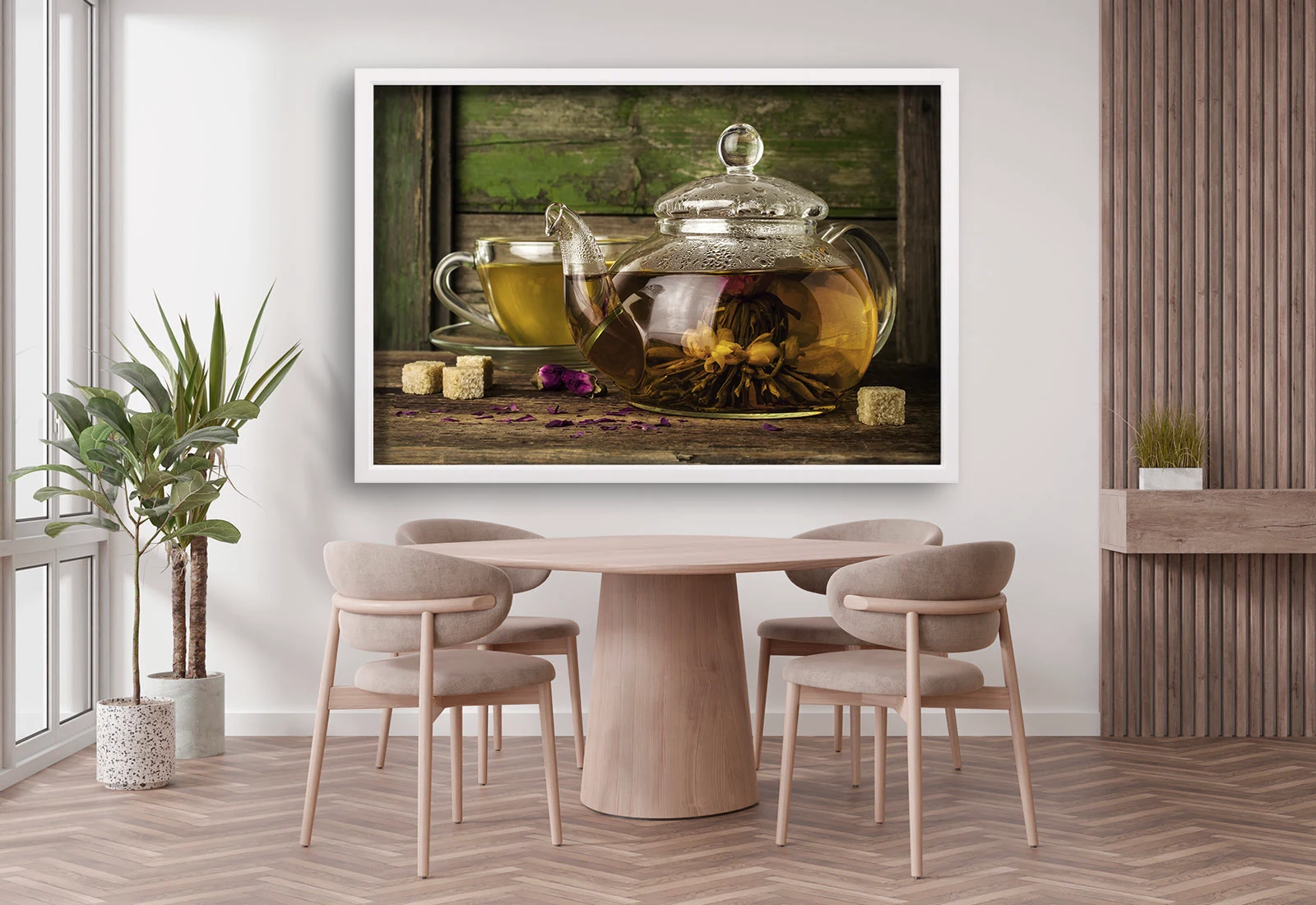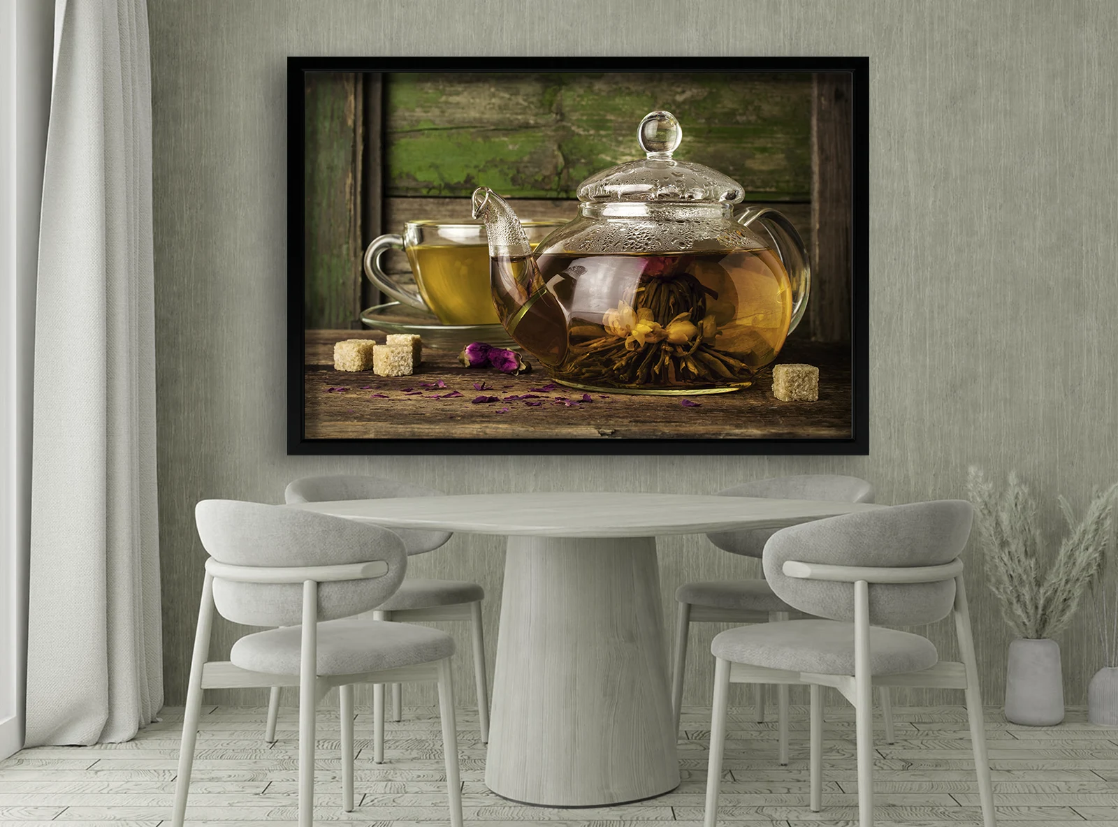 Эта изысканная картина передаёт атмосферу уюта и спокойствия, которую дарит аромат свежезаваренного чая. Прозрачный чайник с цветочным настоем и чашка на фоне состаренного дерева создают гармоничное сочетание тепла и естественности. Картина прекрасно подойдёт для кухни, чайной, кофейни или ресторана, добавляя интерьеру нотку спокойствия и эстетики. Чёрная рама подчёркивает глубину композиции и делает её универсальной для любого стиля оформления.