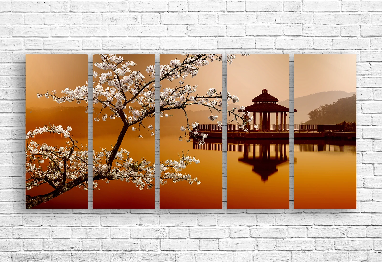 ✅ Картина модульная с ветвями сакуры и беседкой над гладью озера. ✓ Фото на холсте в Кишинёве. 🚚 Доставка по Молдове. ⭐ Печать на холсте - Art-Design.md