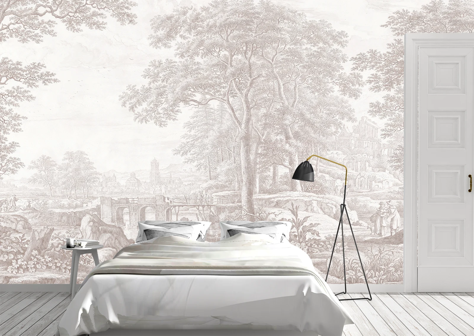 Эти фотообои создают в спальне атмосферу утончённой классики благодаря тонкому графическому рисунку, выполненному в мягких пастельных оттенках. Пейзаж с деревьями, старинными мостами и архитектурой напоминает иллюстрации старых гравюр и дарит ощущение спокойствия и глубины. Лёгкий контраст между деталями и фоном делает композицию воздушной и ненавязчивой, что идеально подходит для зон отдыха. Обои визуально расширяют пространство, создавая эффект лёгкой перспективы. Они гармонично сочетаются с деревянной мебелью, текстилем в натуральных оттенках и светлой отделкой. Такой дизайн подойдёт для спальни, гостевой комнаты или уютного уголка дома, где важна спокойная и уравновешенная атмосфера. Фотообои подчёркивают стиль интерьера и добавляют благородства без лишней яркости.