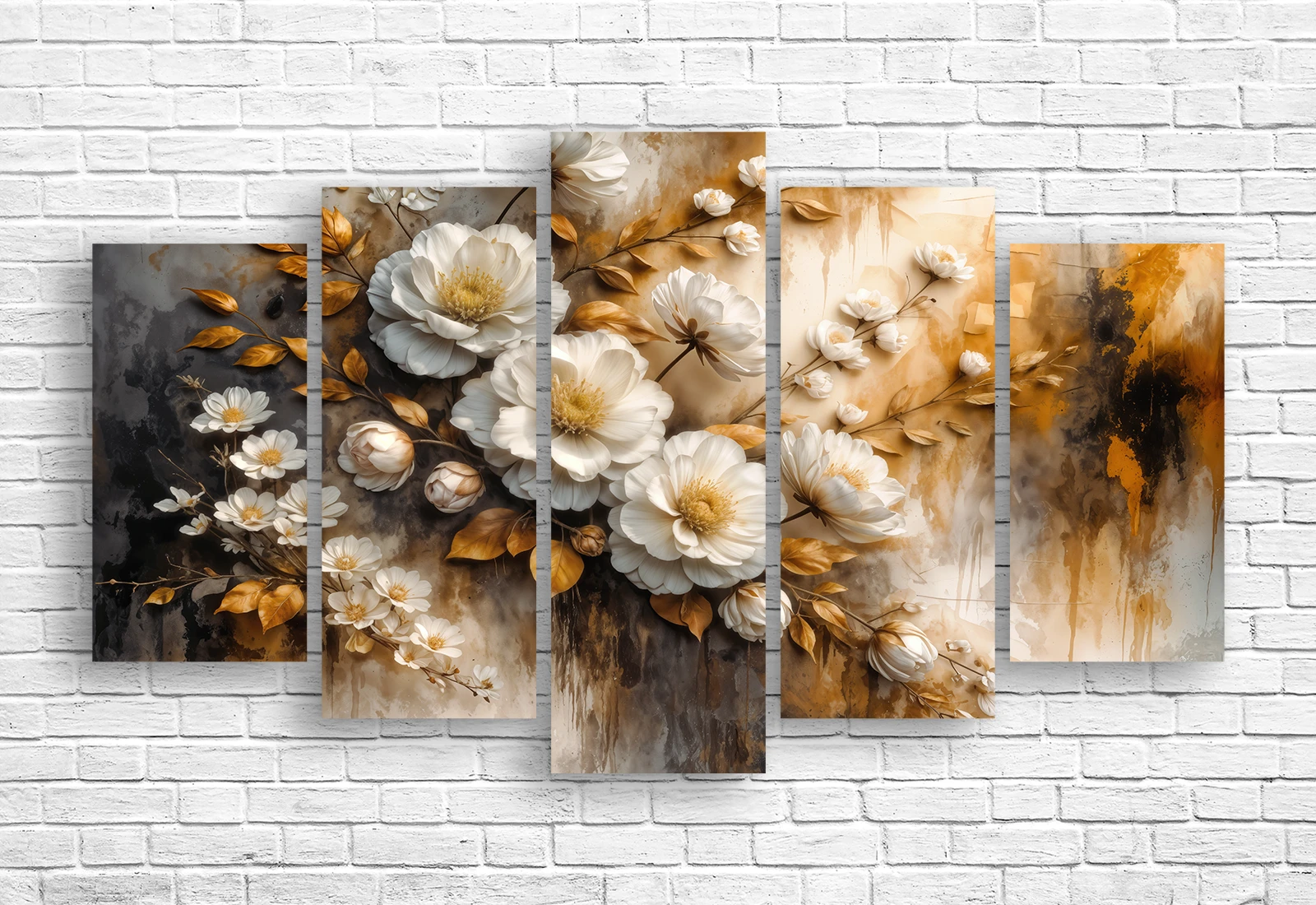 Модульная картина «Белые цветы и золотые листья» воплощает утонченную красоту флористической композиции в благородной цветовой гамме. Нежные белые соцветия — возможно, пионы, розы или полевые цветы — распускаются на фоне изящных золотых листьев, переливающихся теплым блеском.