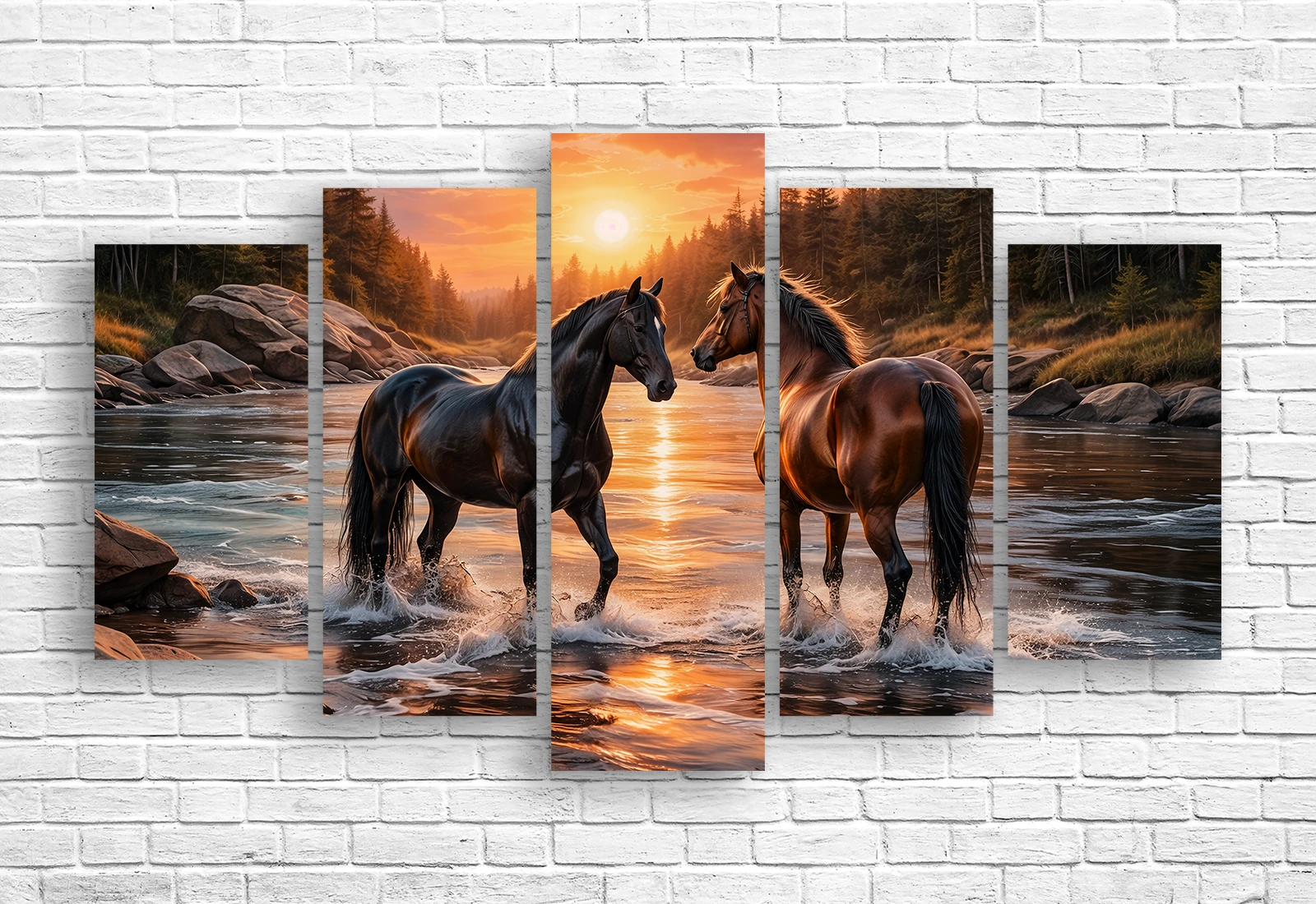 Модульная картина с невероятно живописным и умиротворяющим сюжетом, запечатлевшая двух грациозных коней в зеркальных водах лесной реки в час золотого заката, станет великолепным украшением вашего интерьера.