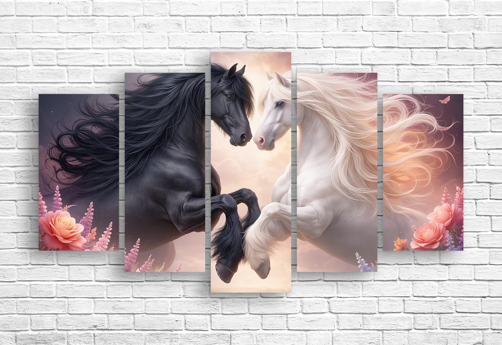 Модульная картина с невероятно поэтичным и магическим сюжетом, представляющая собой панорамный полиптих из пяти модулей с изображением черного и белого коней, станет завораживающим акцентом вашего интерьера.