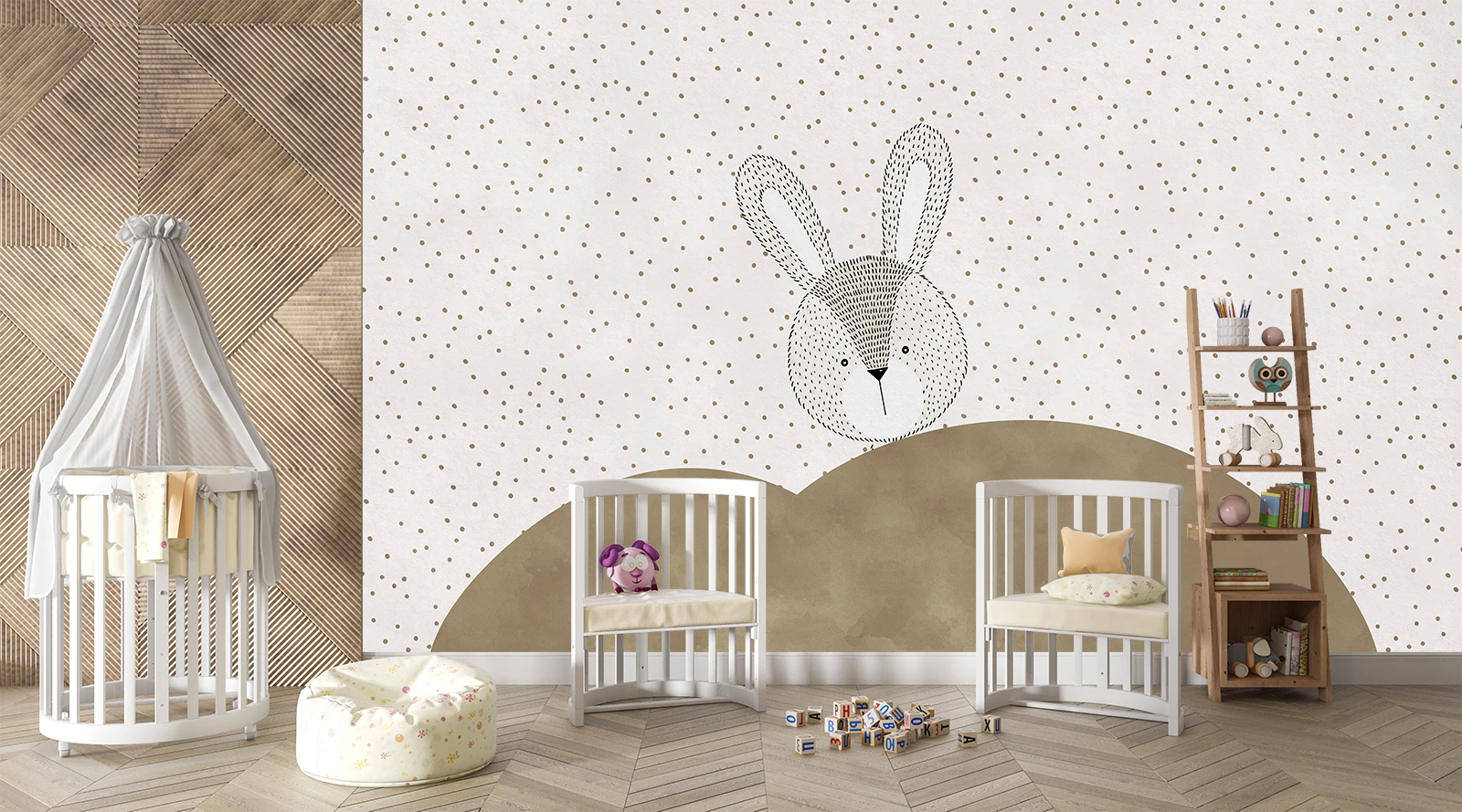 Фотообои «Зайчик в точках для детской» создают мягкую и уютную атмосферу в комнате ребёнка. Иллюстрация с милым зайчиком выполнена в лаконичном стиле, а фон с аккуратными точками добавляет лёгкости и визуального порядка.