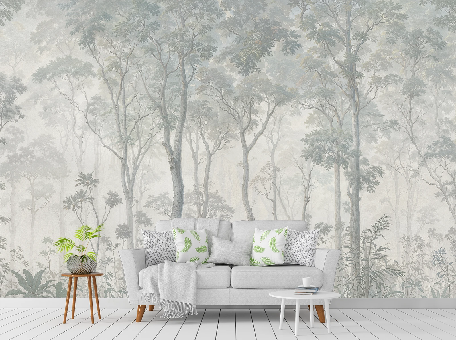 Фотообои с туманным лесом создают атмосферу спокойствия и природной гармонии в интерьере. Лёгкие серо-зелёные оттенки и мягкие силуэты деревьев визуально расширяют пространство и наполняют комнату воздухом.