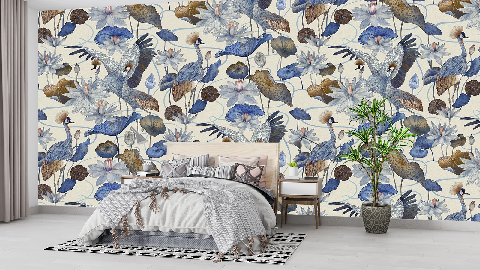 Фотообои с изящными журавлями и цветами лотоса создают утончённый и стильный интерьер. Сочетание голубых, бежевых и природных оттенков придаёт пространству свежесть и гармонию.