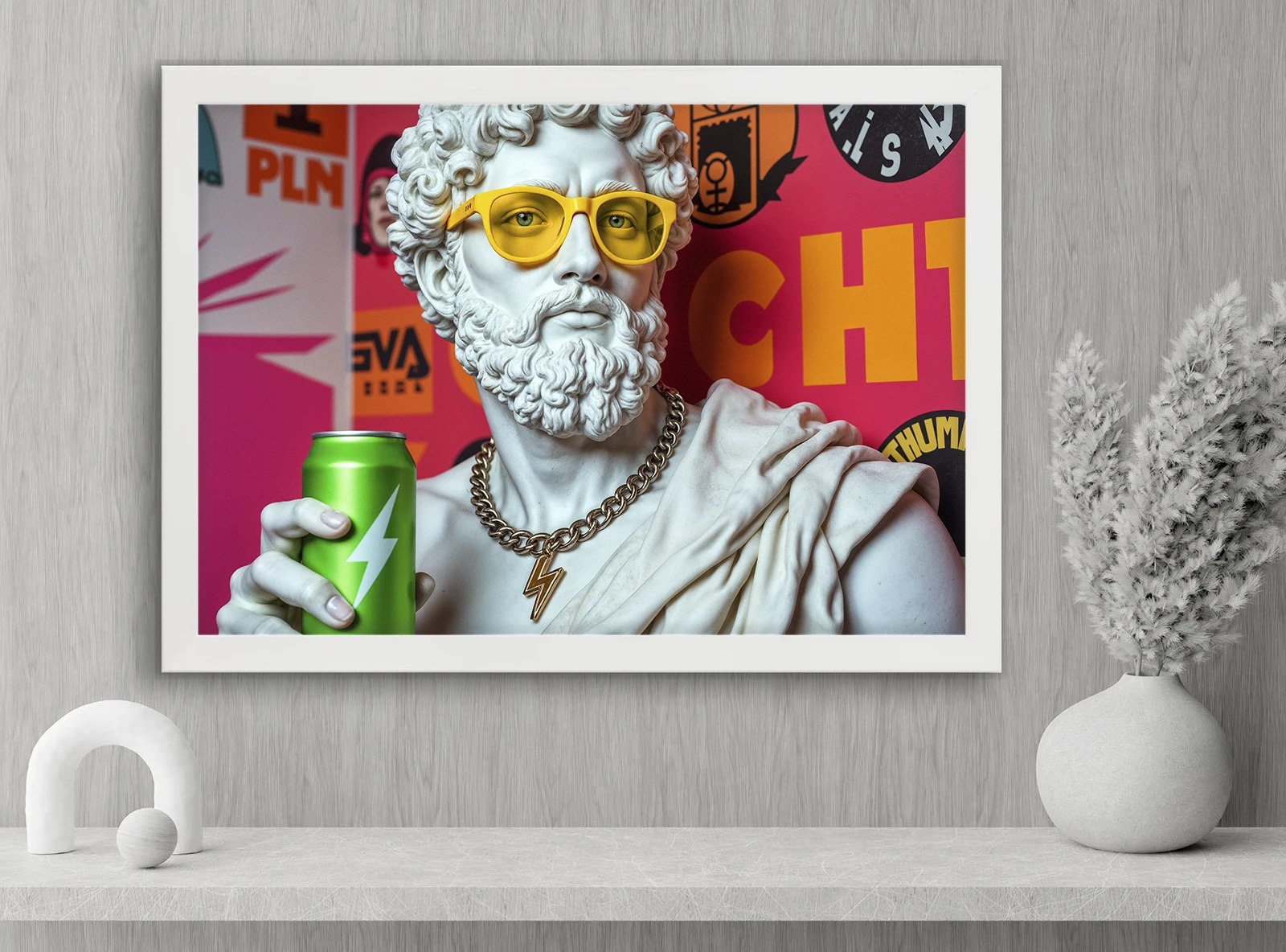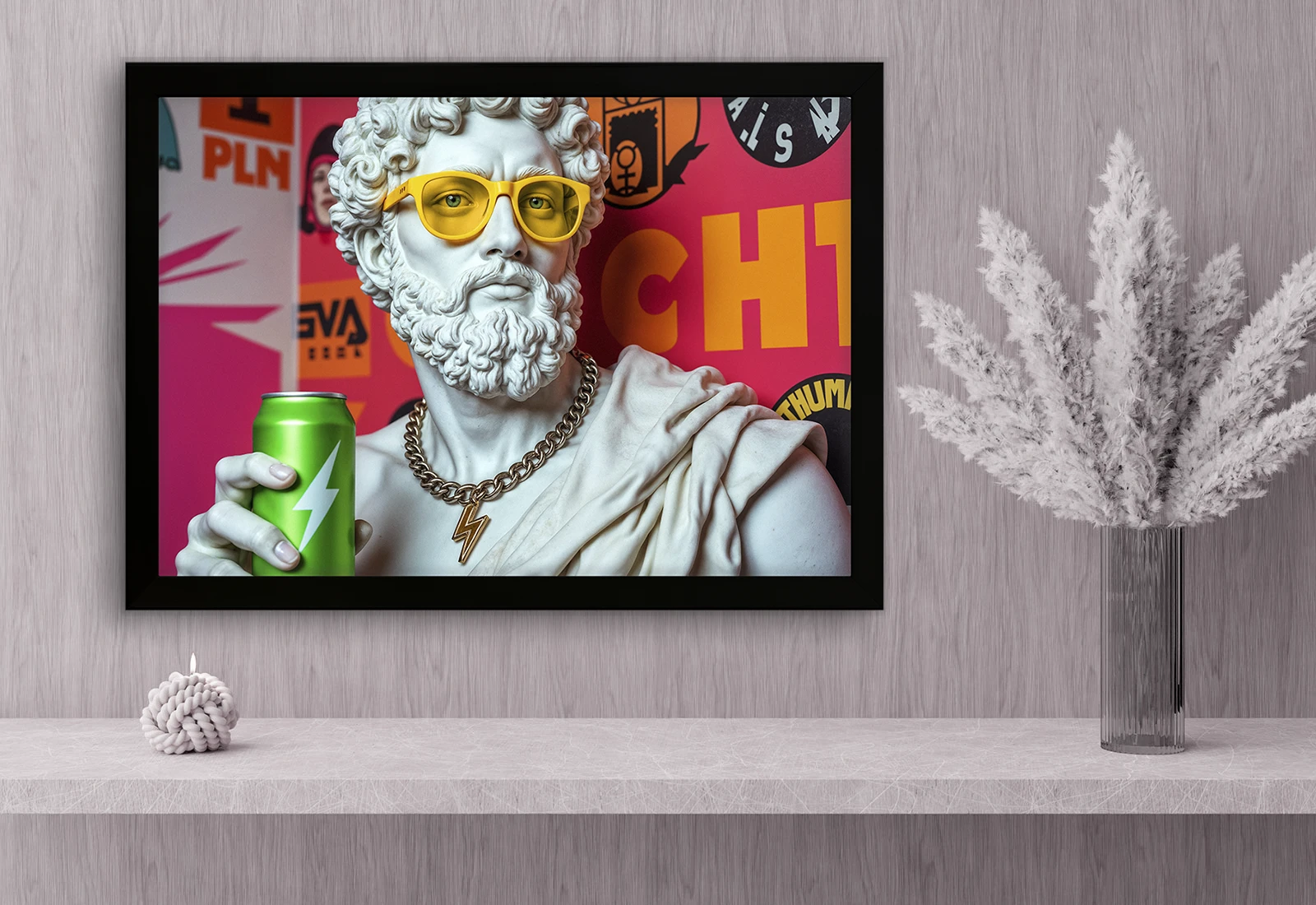 Эта картина сочетает классическую античную скульптуру с ярким современным поп-арт стилем. Статуя в модных очках с напитком и ярким фоном создаёт динамичный и запоминающийся образ.