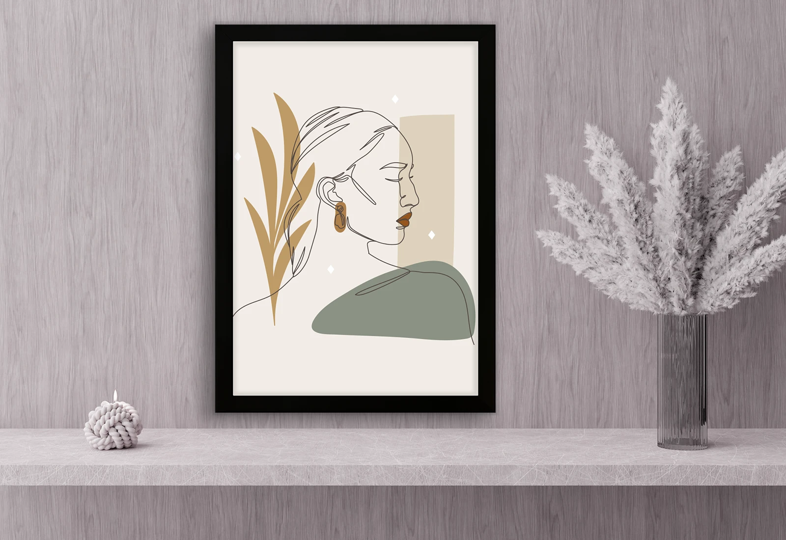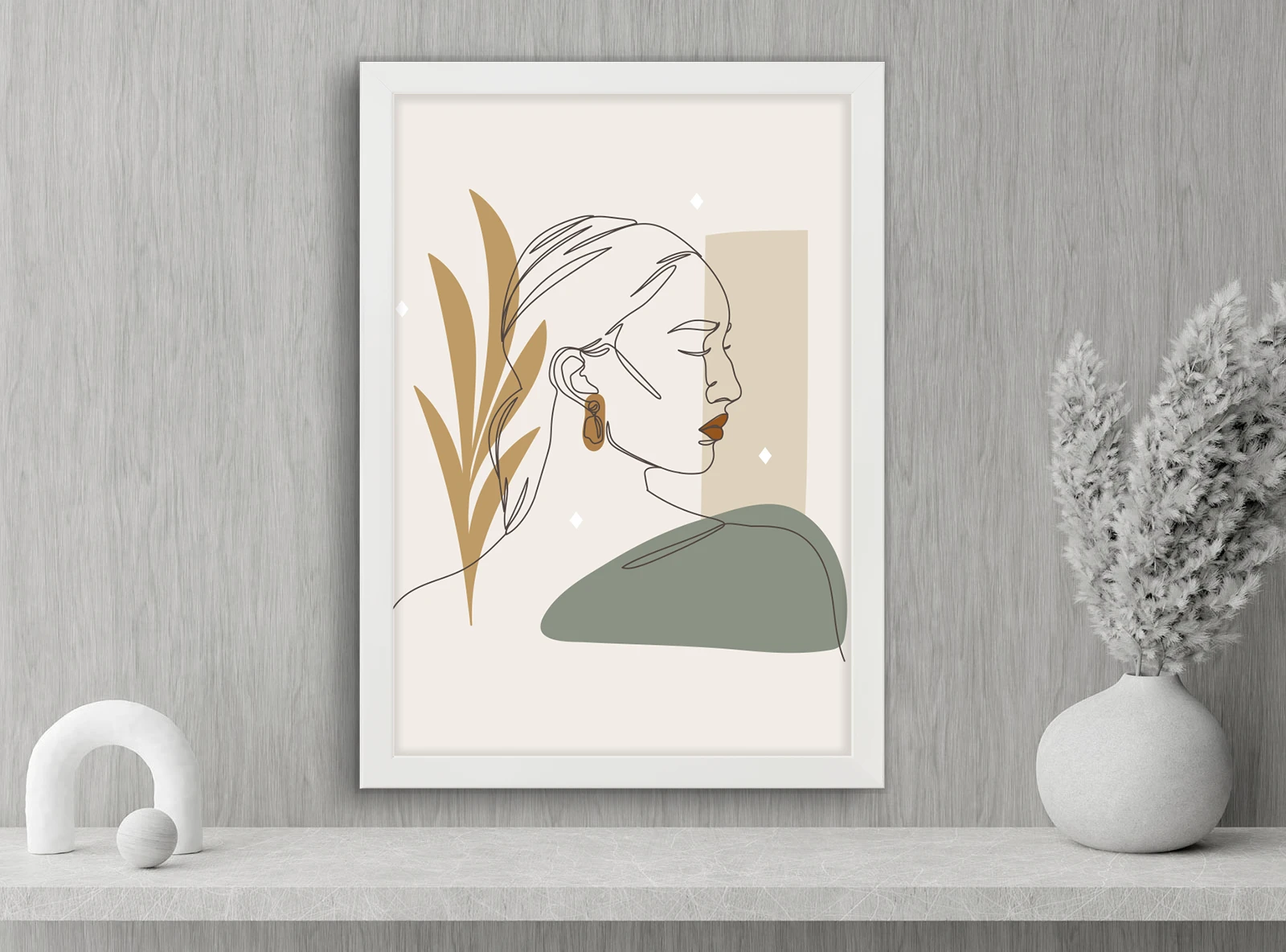 Эта картина выполнена в стиле минимализма и изображает женский профиль в виде тонкого линейного рисунка. Листья и природные элементы добавляют композиции свежесть и гармонию, а мягкие оттенки создают спокойную и уютную атмосферу.