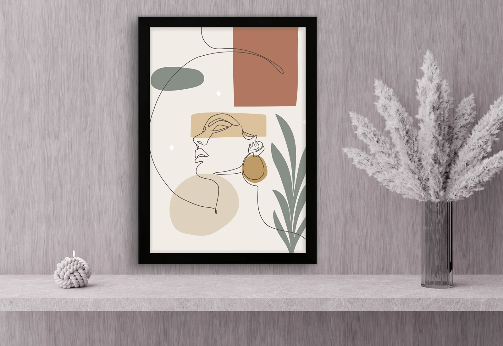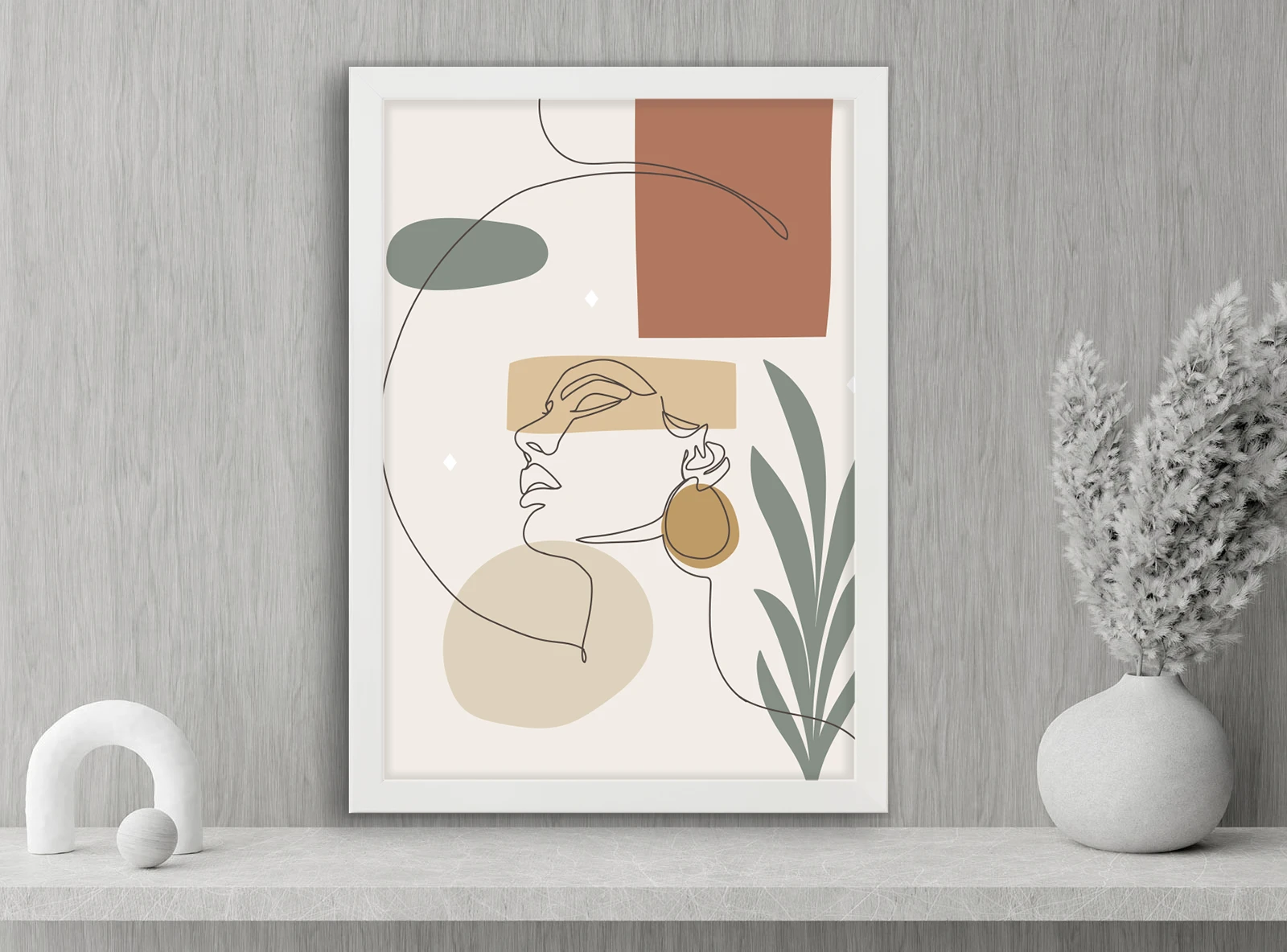 Эта картина сочетает в себе абстрактные формы и изящный женский портрет, выполненный тонкими линиями. Композиция дополнена декоративными элементами в виде листьев и геометрических фигур, создающих гармоничное и современное настроение.