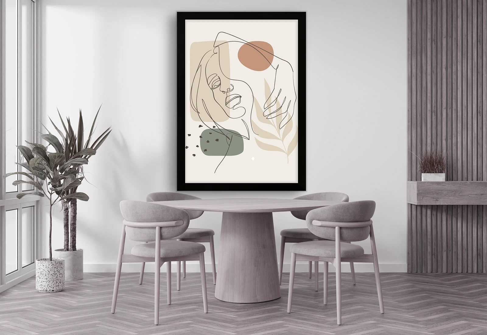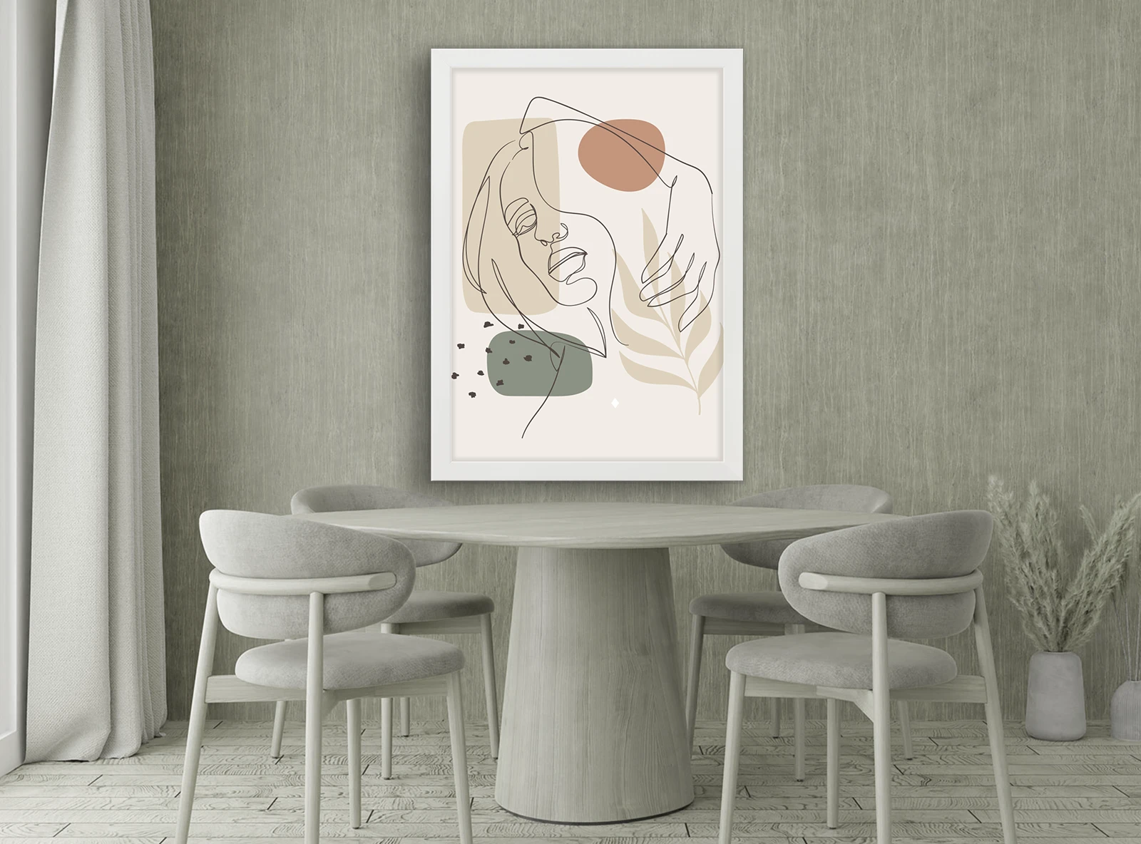 Мягкие натуральные оттенки создают спокойную и уютную атмосферу, идеально подходящую для современного интерьера. Белая рама подчеркивает лёгкость и чистоту дизайна.