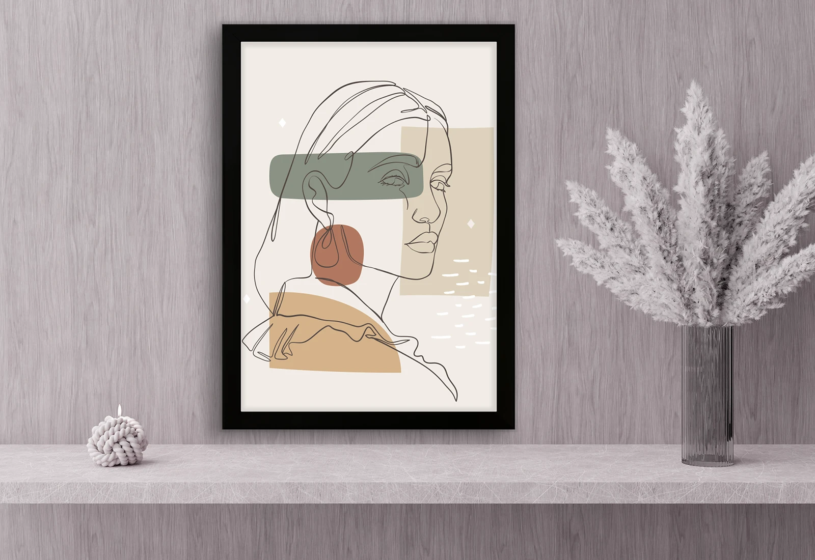 Эта картина выполнена в современном минималистичном стиле и изображает женский портрет, созданный тонкими непрерывными линиями. Геометрические формы и мягкие природные оттенки формируют гармоничную композицию, которая легко вписывается в интерьер.