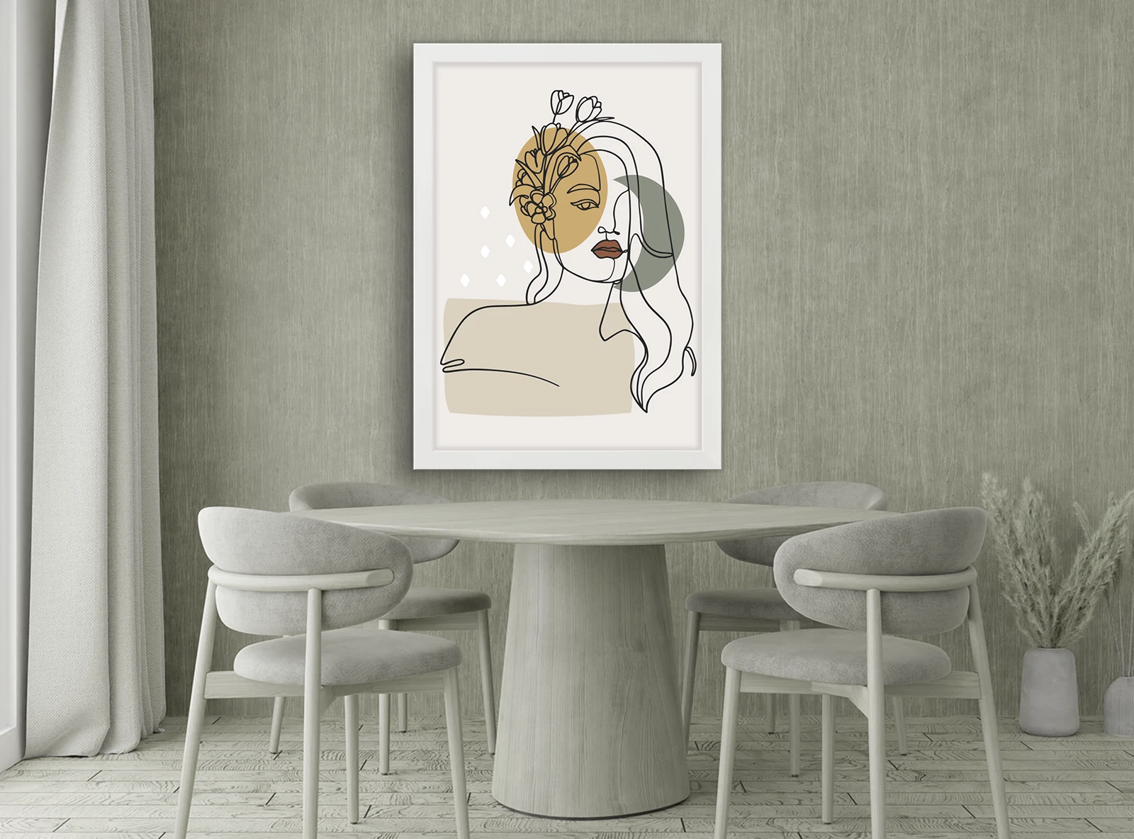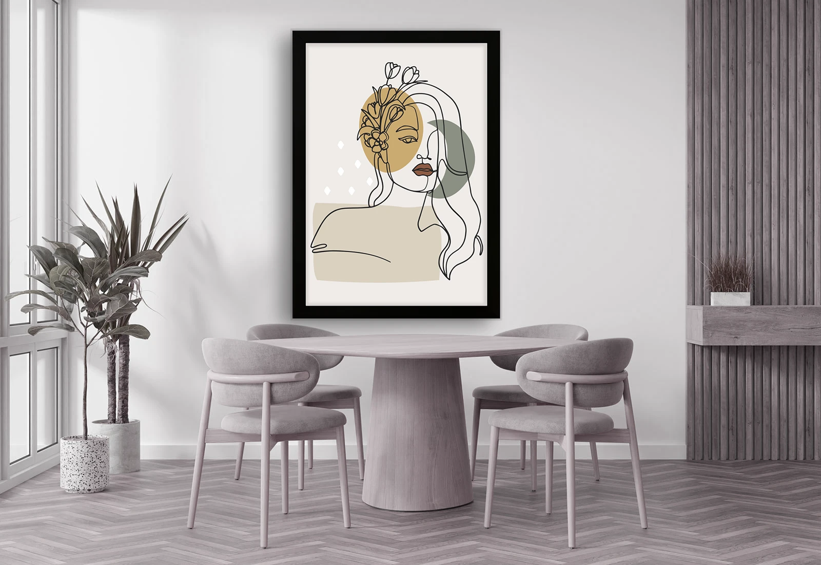 Эта картина выполнена в современном минималистичном стиле и изображает женский портрет, дополненный изящными цветочными элементами. Тонкие линии формируют утончённый силуэт, а мягкие природные оттенки создают гармоничную и спокойную композицию.