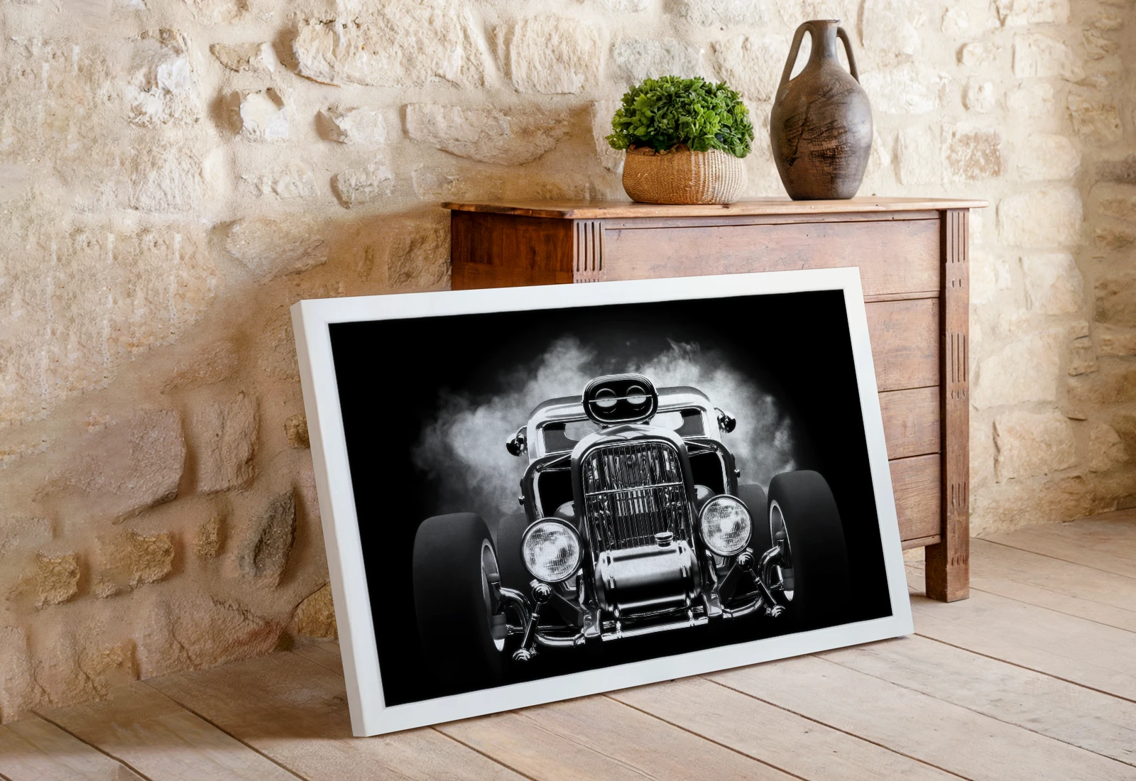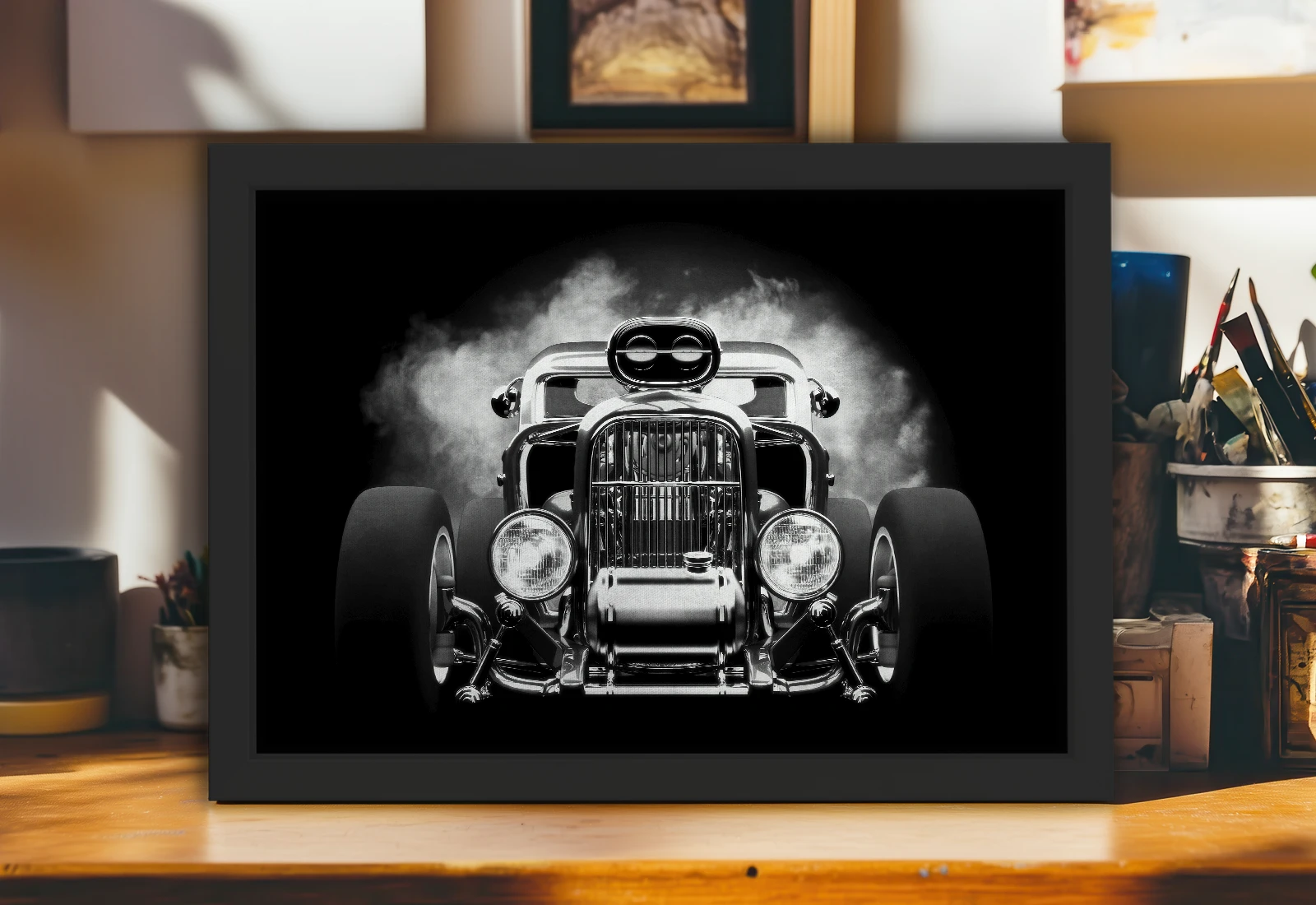 Дым за машиной добавляет ощущение движения и драйва. Такая картина отлично впишется в интерьер в стиле лофт или гаражной эстетики, подчёркивая индивидуальность пространства.
