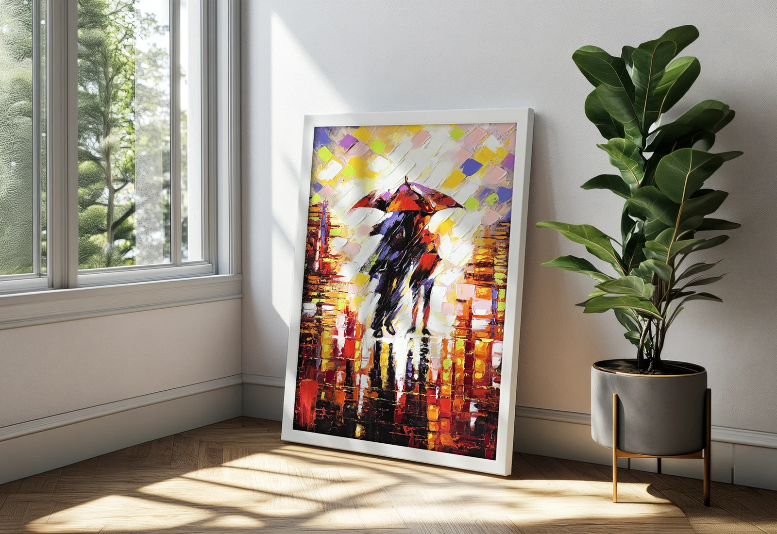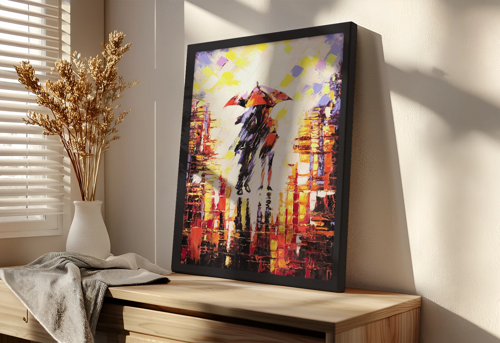 Картина оформлена в элегантную черную раму, подчеркивающую взрыв красок ночного города и силуэты пары под красным зонтом. Благодаря экологичным латексным чернилам, цвета остаются насыщенными и глубокими.