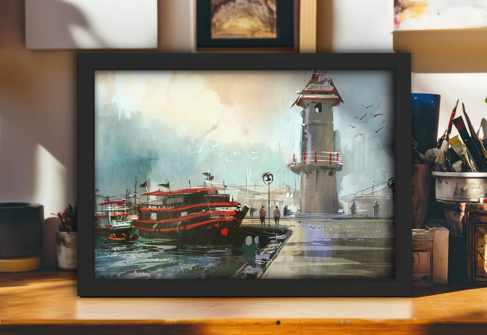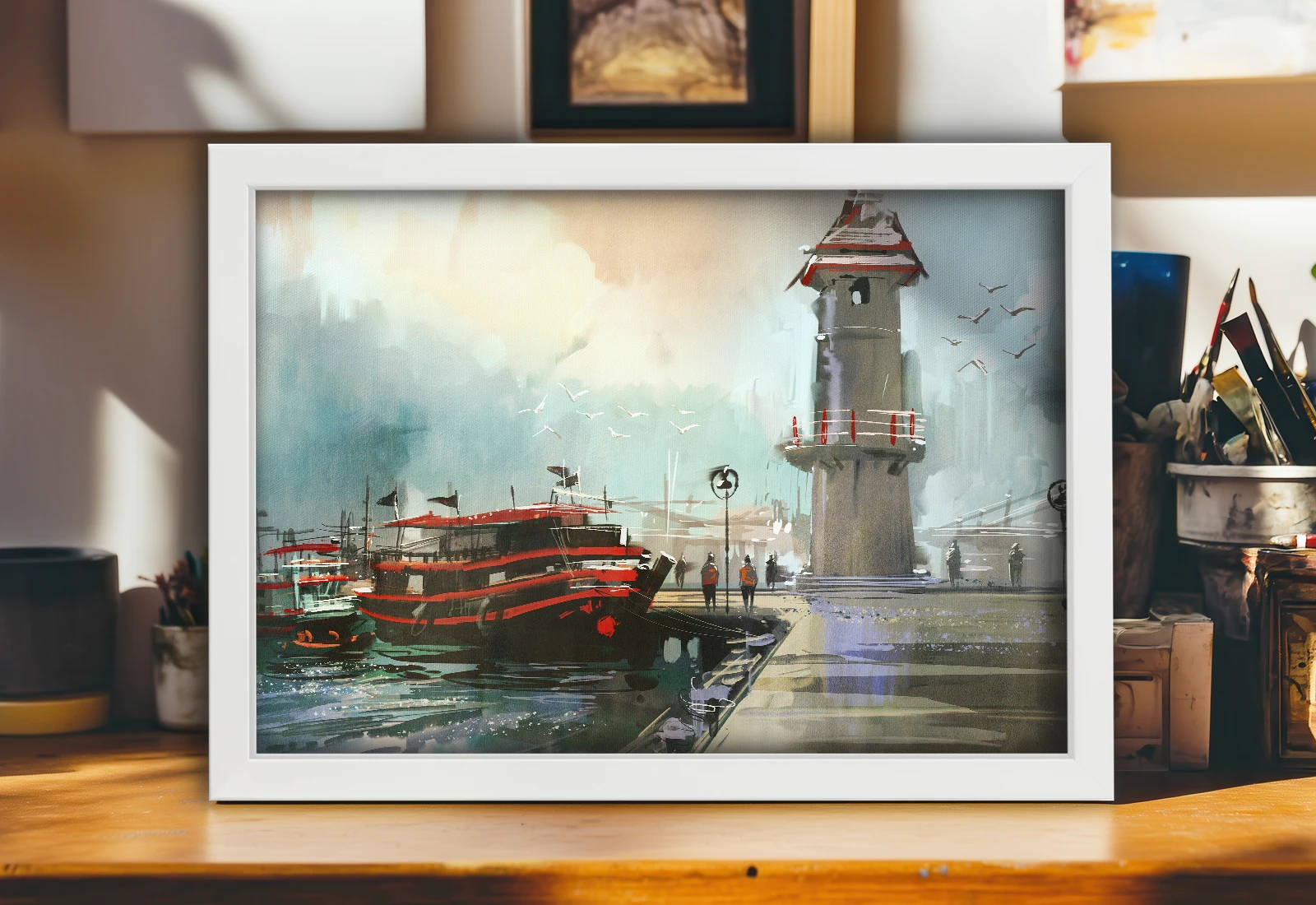 Картина оформлена в элегантную белую раму, подчеркивающую динамику сцены в порту с красными судами у причала и величественным маяком. Благодаря экологичным латексным краскам, цвета остаются глубокими и реалистичными.