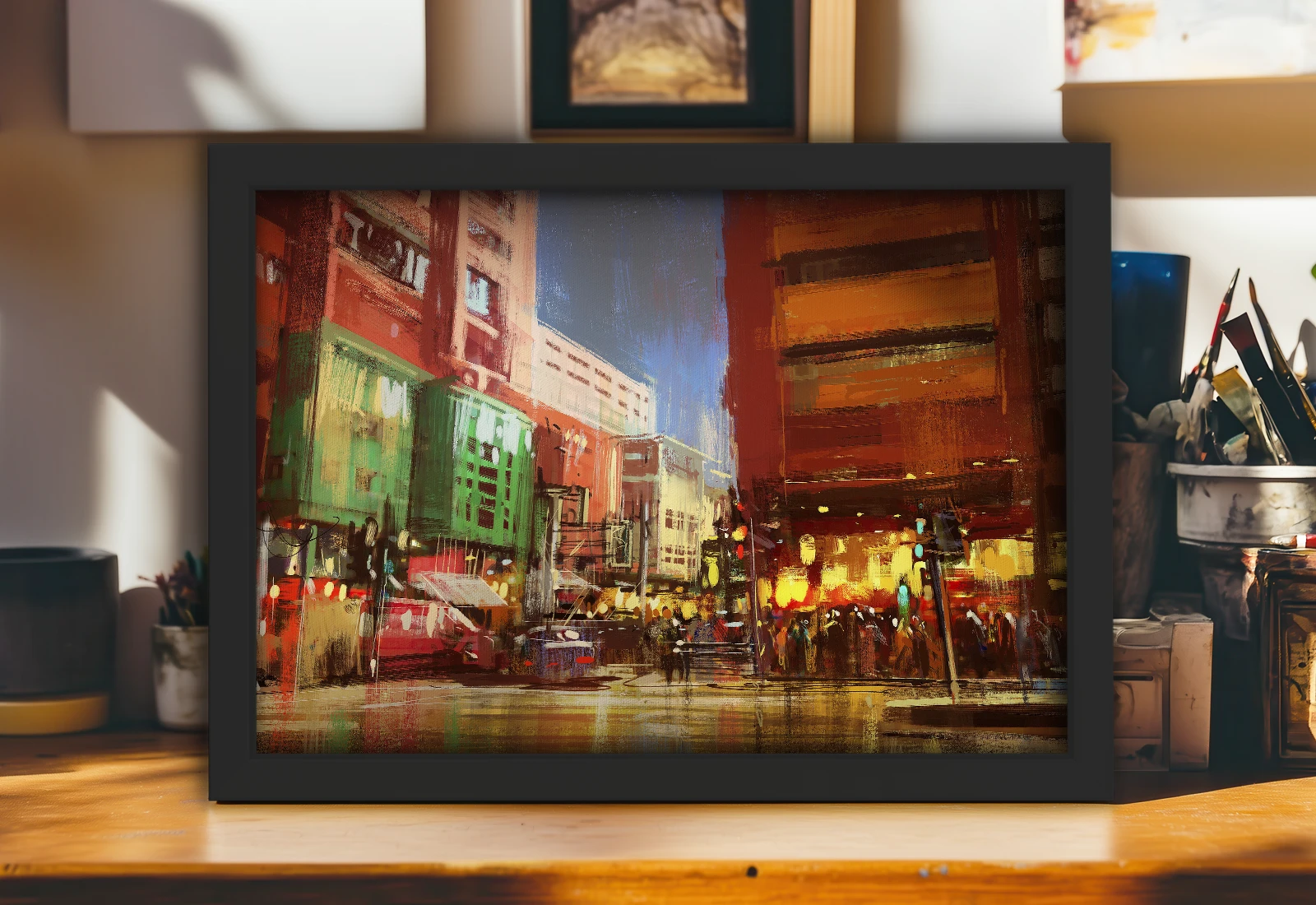 Картина оформлена в элегантную черную раму, подчеркивающую динамику городского пейзажа и неоновые огни витрин. Благодаря экологичным латексным краскам, цвета остаются насыщенными и глубокими.
