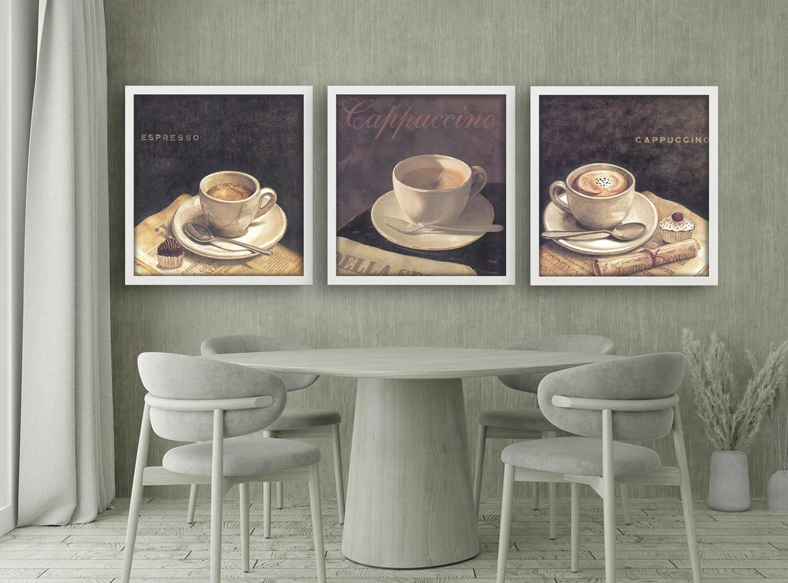Набор состоит из трех картин, оформленных в элегантные белые рамы, что позволяет создать гармоничную композицию на кухне или в обеденной зоне.