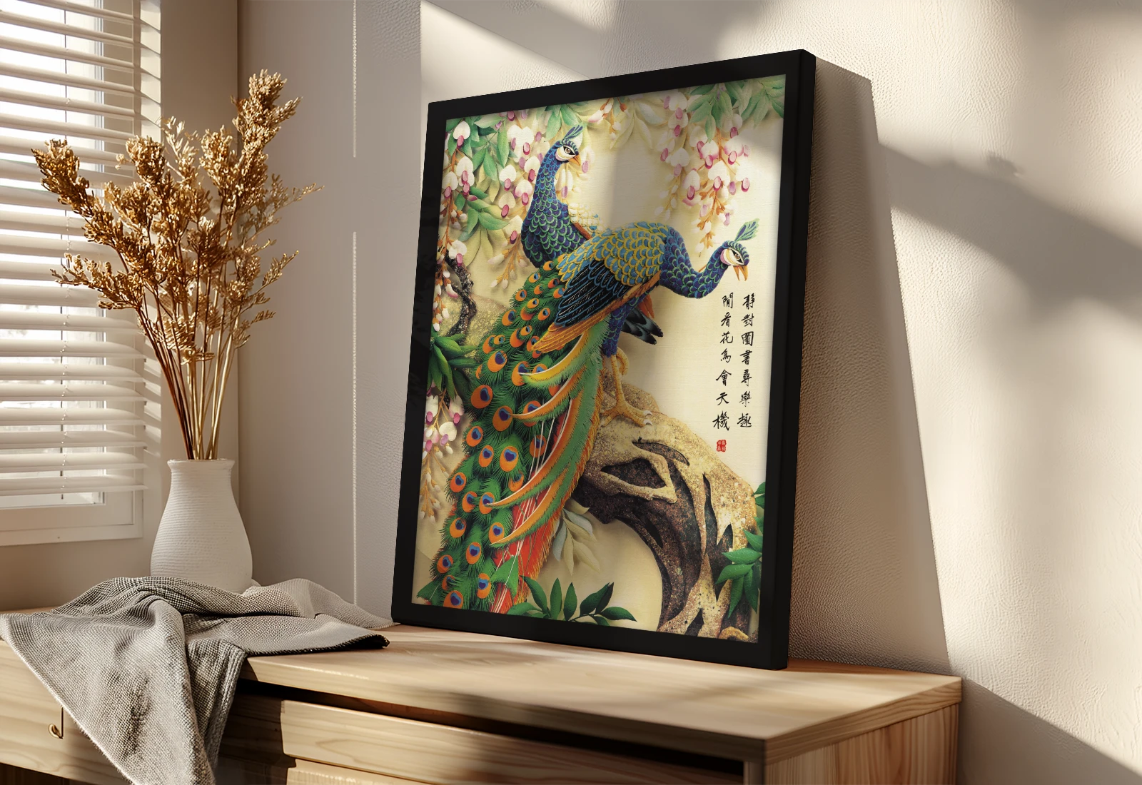 Картина оформлена в элегантную белую раму, подчеркивающую яркость изумрудного оперения павлина и каллиграфические символы, придающие работе особый смысл. Благодаря экологичным латексным краскам, цвета остаются насыщенными.