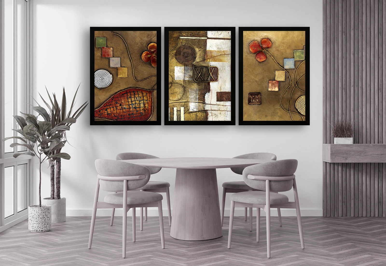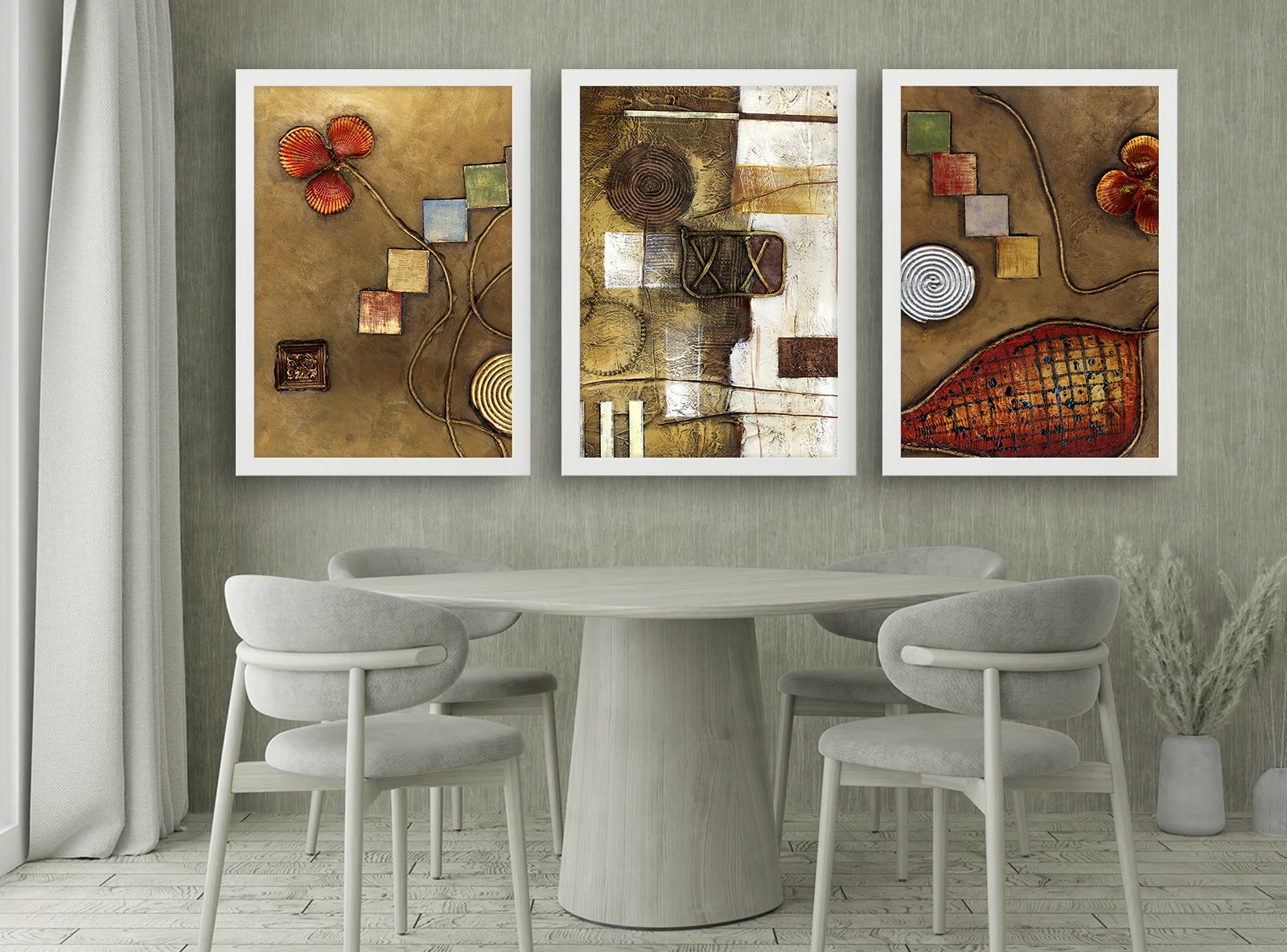 Набор состоит из трех вертикальных картин в лаконичных белых рамах, которые освежают композицию и позволяют гармонично вписать насыщенные охристые и терракотовые оттенки в современное пространство.
