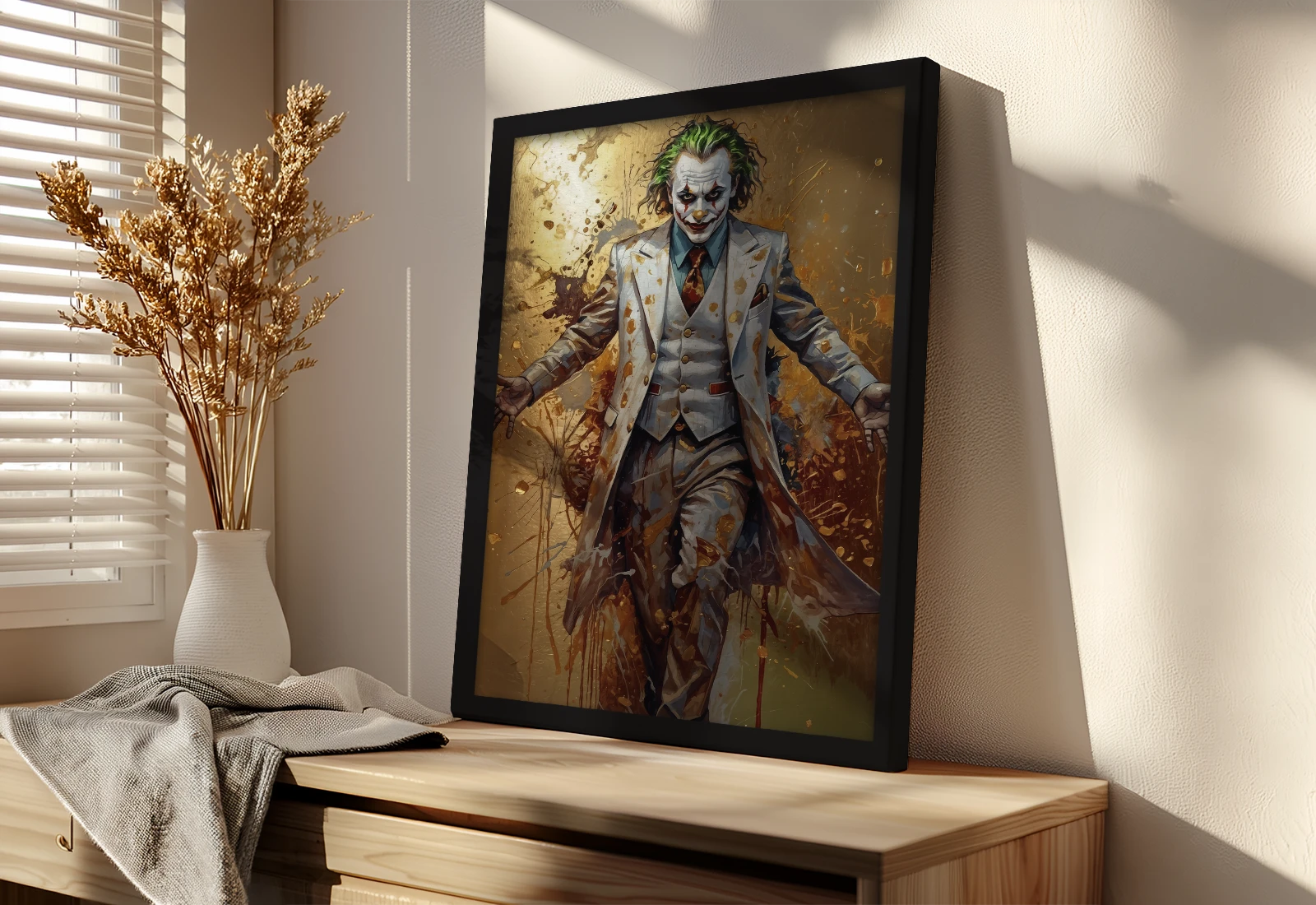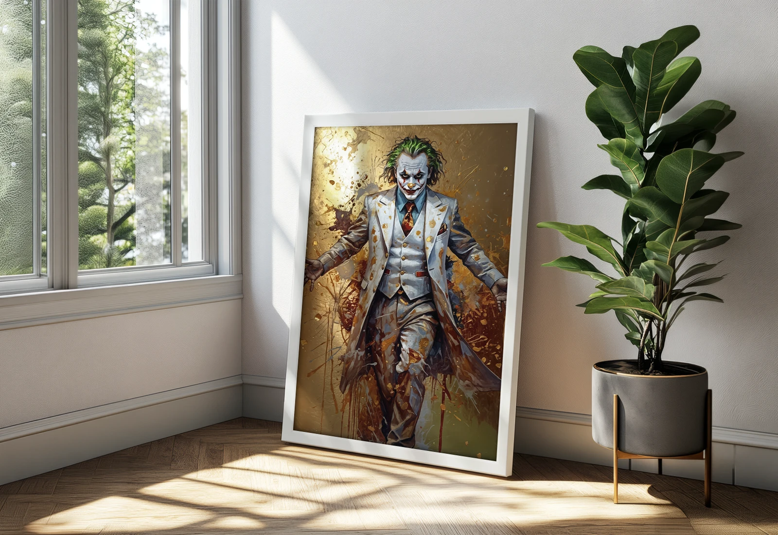 На изображении Джокер показан в светлом костюме на фоне хаотичных золотых брызг. Контраст тёмного и яркого усиливает выразительность, а взгляд персонажа делает сцену напряжённой и запоминающейся.