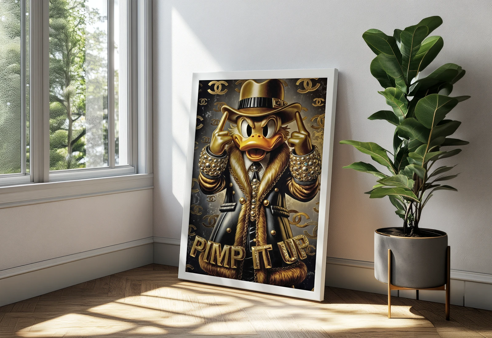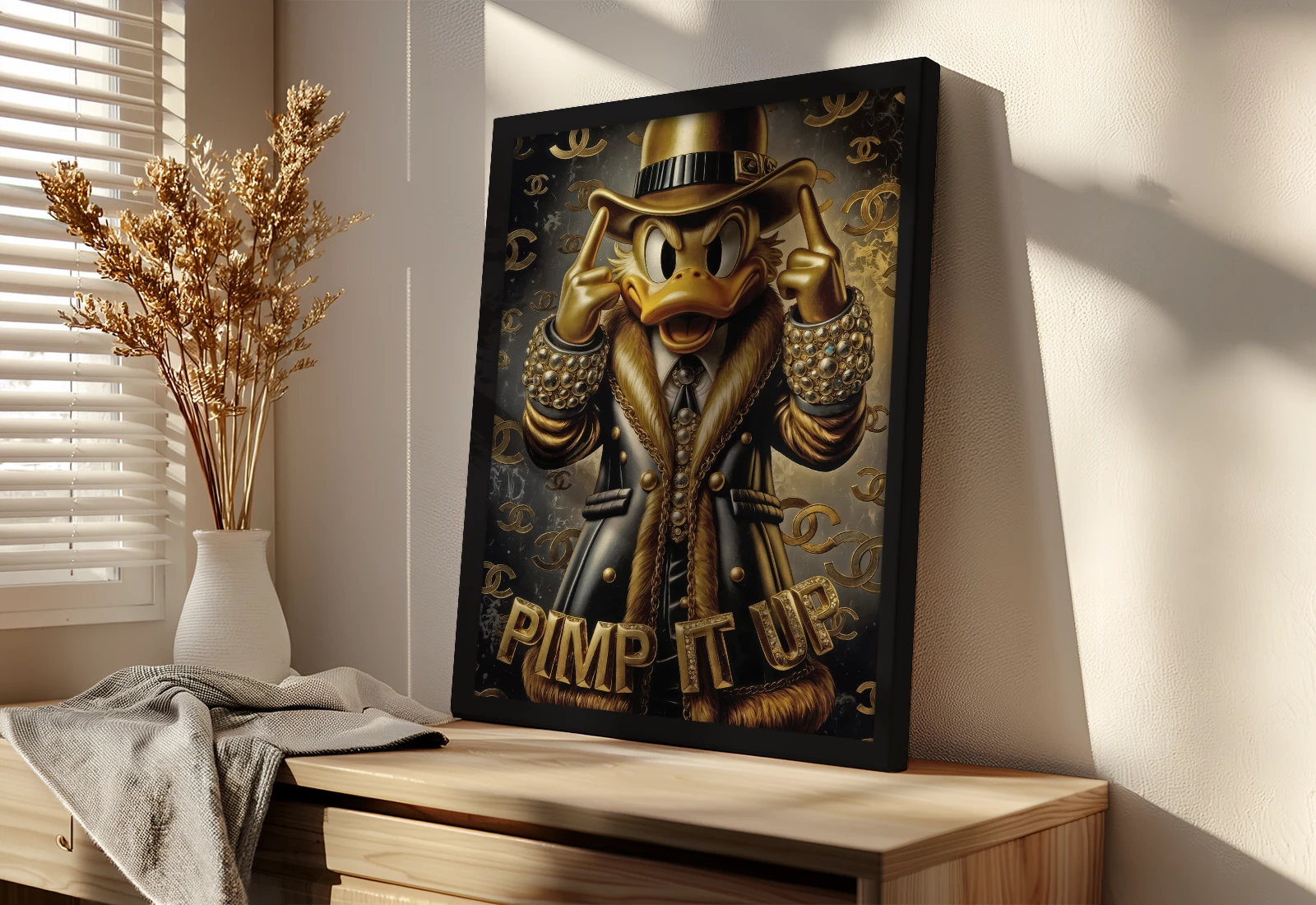 Предлагаю готовую картину на холсте с изображением Дональда Дака в золотом стиле. Изображение нанесено на плотный холст методом фотопечати — цвета насыщенные, контуры чёткие, металлический эффект передан без искажений. Холст натянут на деревянный подрамник. В комплекте идёт простая рама: на выбор белая или чёрная. Рама защищает края холста и даёт аккуратный переход к стене. Такой Дональд Дак подойдёт для гостиной, кабинета, игровой комнаты или лофта. Золотой стиль — это сочетание поп-арта и люкса: жирная линия, глубокие тени, сияющий металлик на клюве, кепке и пуговицах.