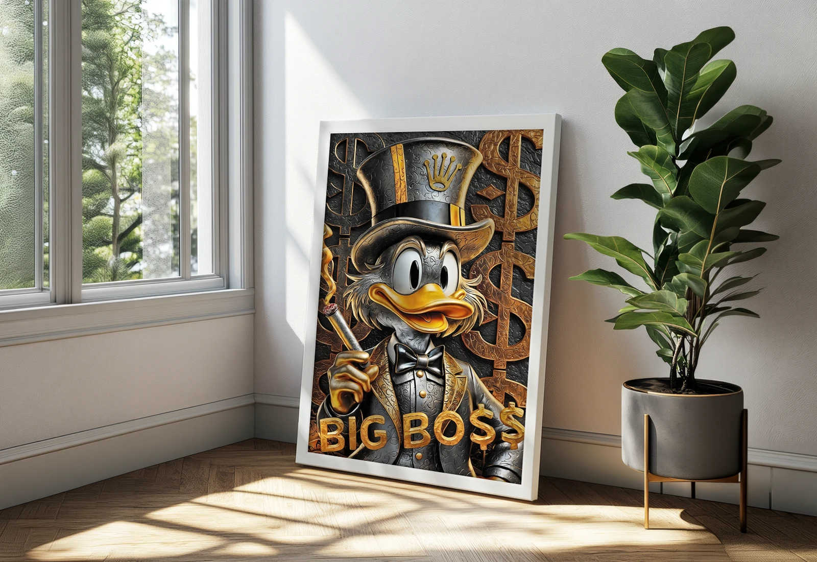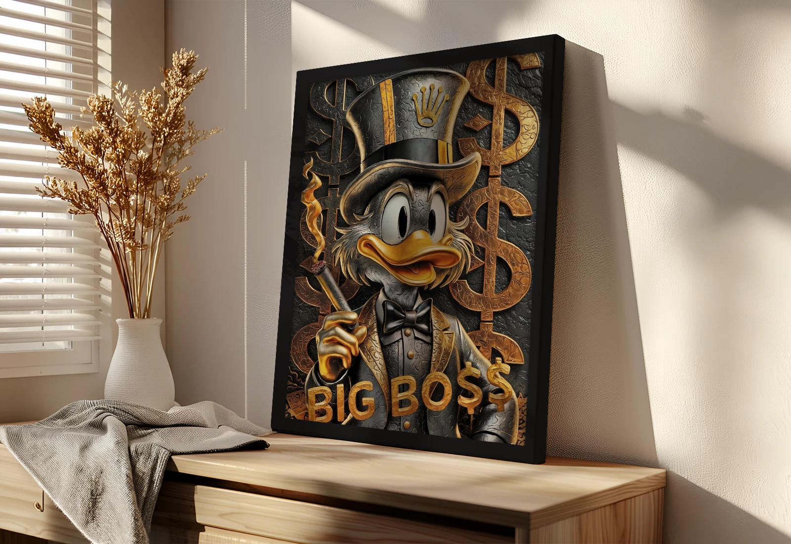 ✅ Картина на холсте с Дональдом Big Boss и золотыми элементами. ✓ Чёткие детали и выразительный персонаж. 🚚 Доставка по Кишинёву и Молдове. ⭐ Art-Design.md
