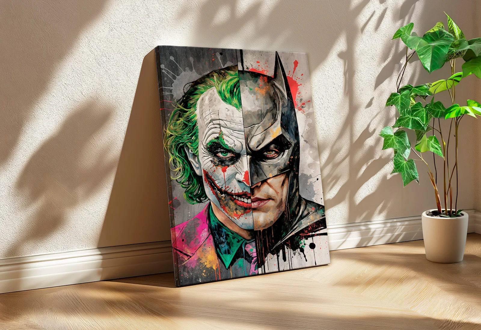 Яркие, хаотичные мазки на стороне Джокера противопоставлены строгим и мрачным линиям Темного Рыцаря, создавая мощное визуальное напряжение. Плотная фактура материала и галерейная натяжка позволяют изображению выглядеть объемно и стильно, превращая его в главный акцент любого пространства.