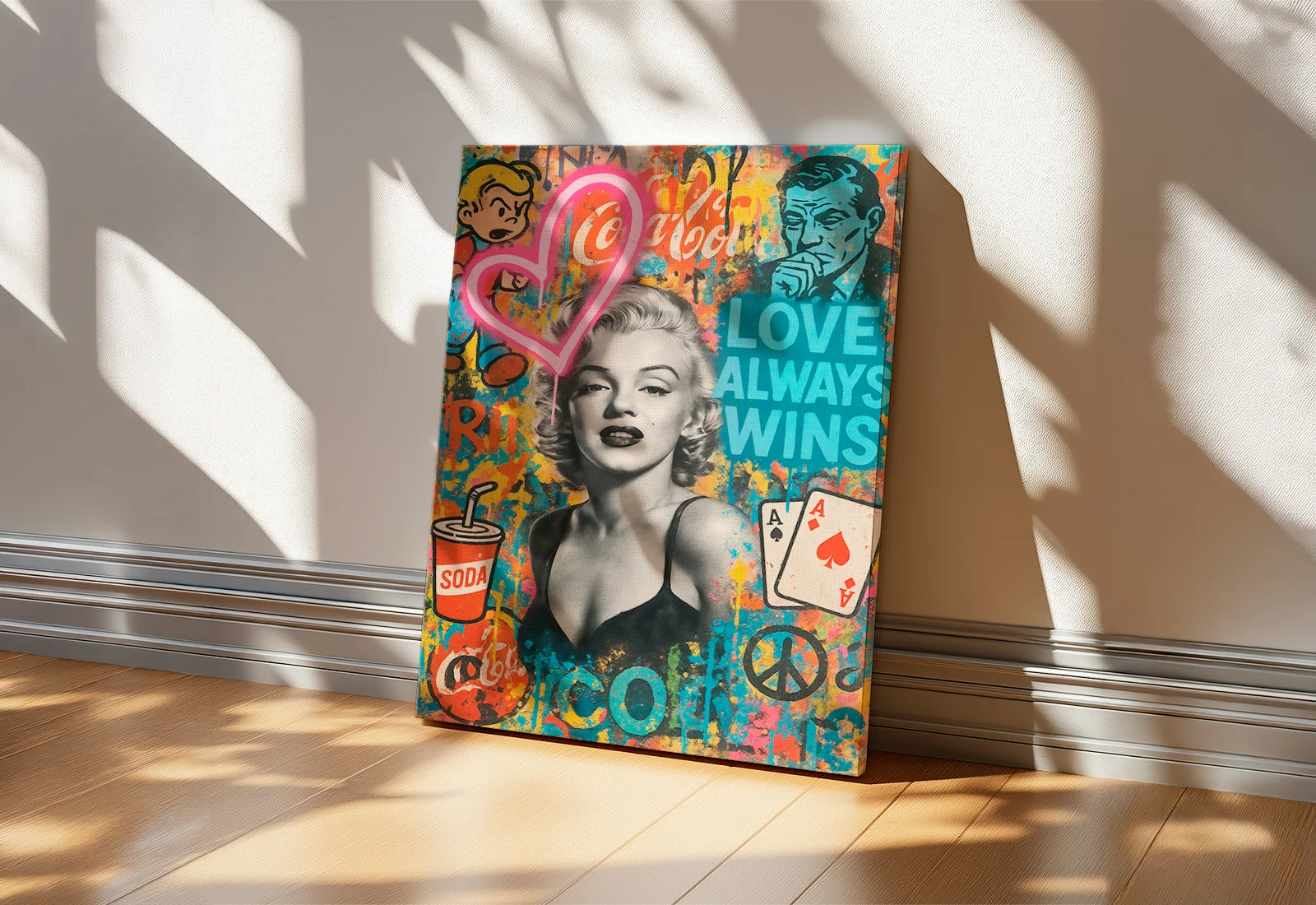 Я смотрю на этот холст и чувствую невероятное сочетание классической женственности и дерзкого современного искусства. Это высококачественная латексная печать на натуральном холсте, представляющая легендарную Мэрилин Монро в окружении ярких элементов поп-арта, винтажной рекламы и жизнеутверждающей надписи "Love Always Wins".