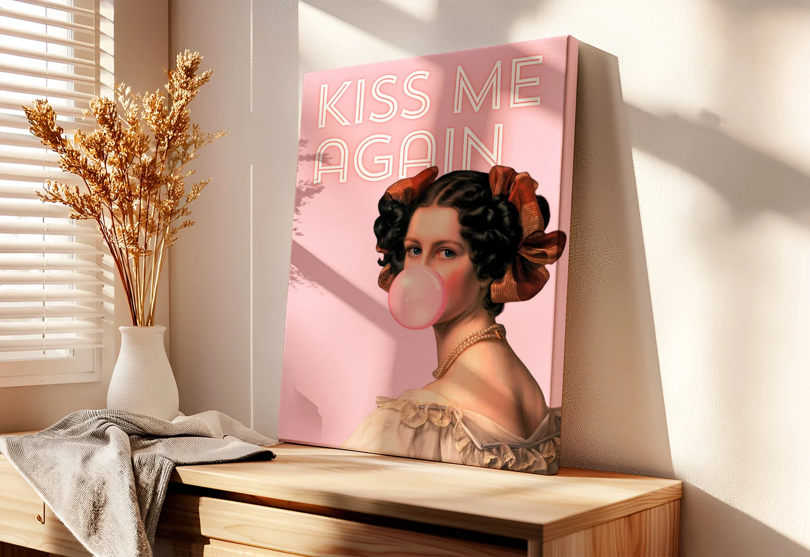 Это высококачественная латексная печать на натуральном холсте, представляющая классический портрет дамы в элегантном наряде, которая надувает пузырь из розовой жвачки на фоне надписи "Kiss Me Again".