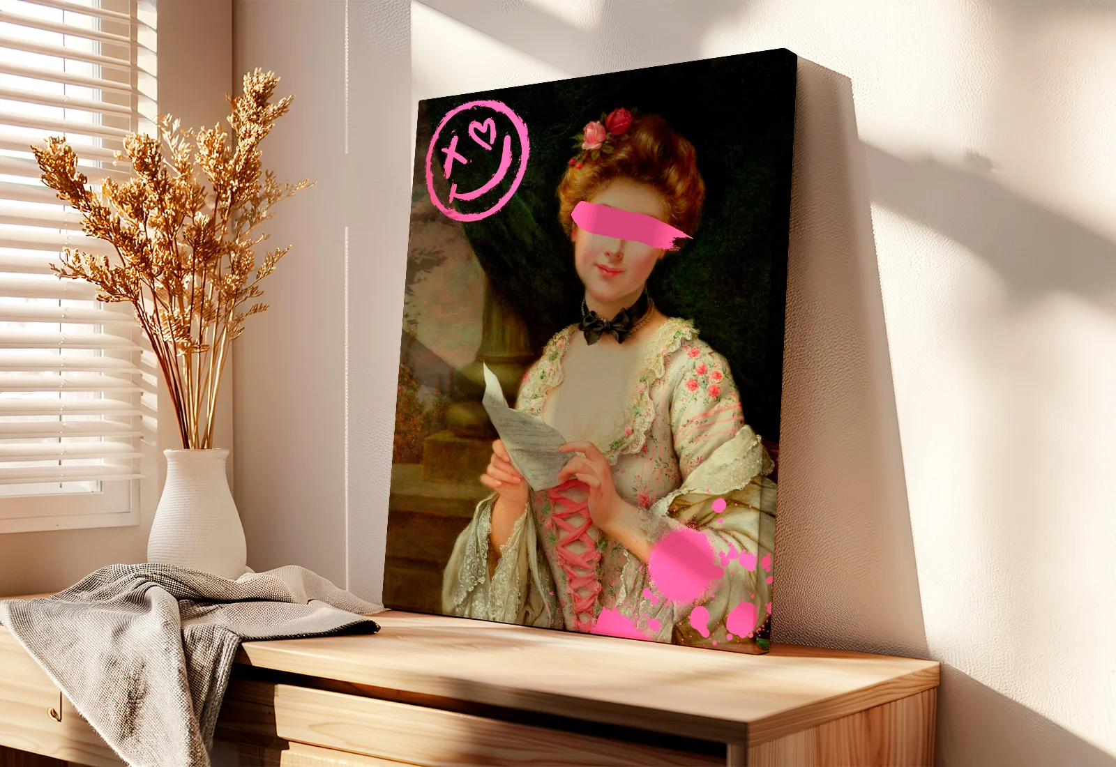 Это высококачественная латексная печать на натуральном холсте, представляющая классический женский портрет с письмом, дополненный дерзким розовым смайлом, закрашенными глазами и экспрессивными брызгами в стиле стрит-арта.