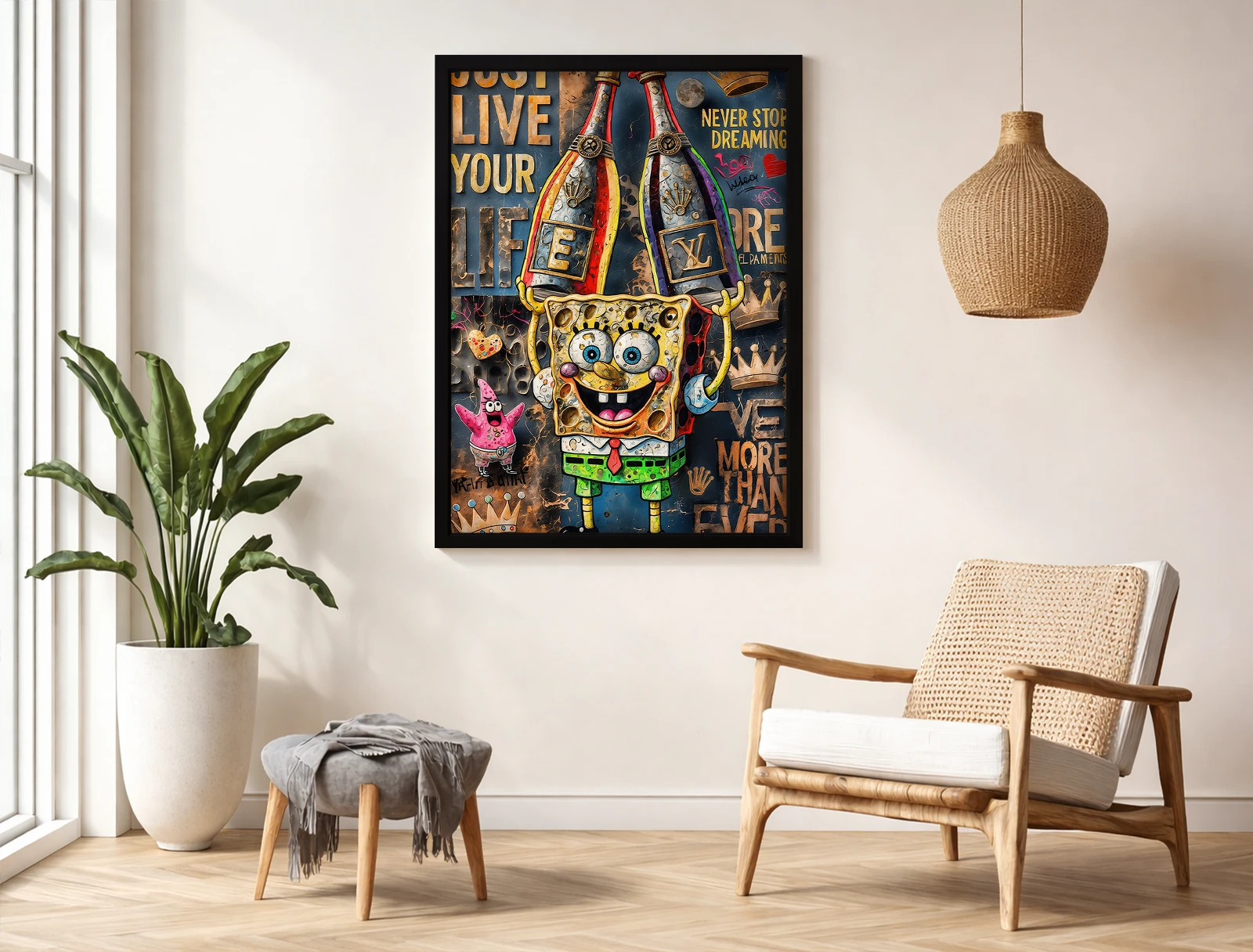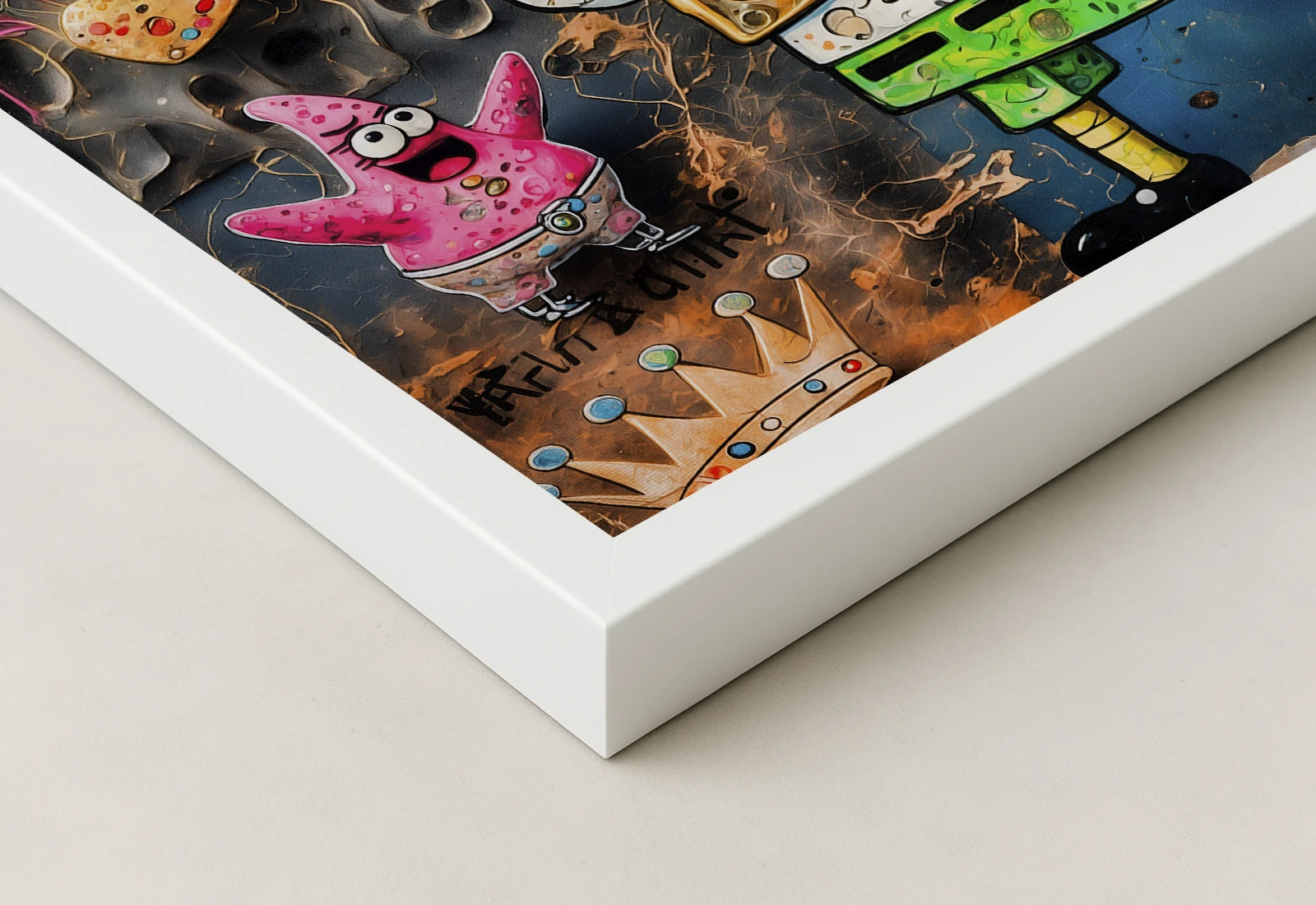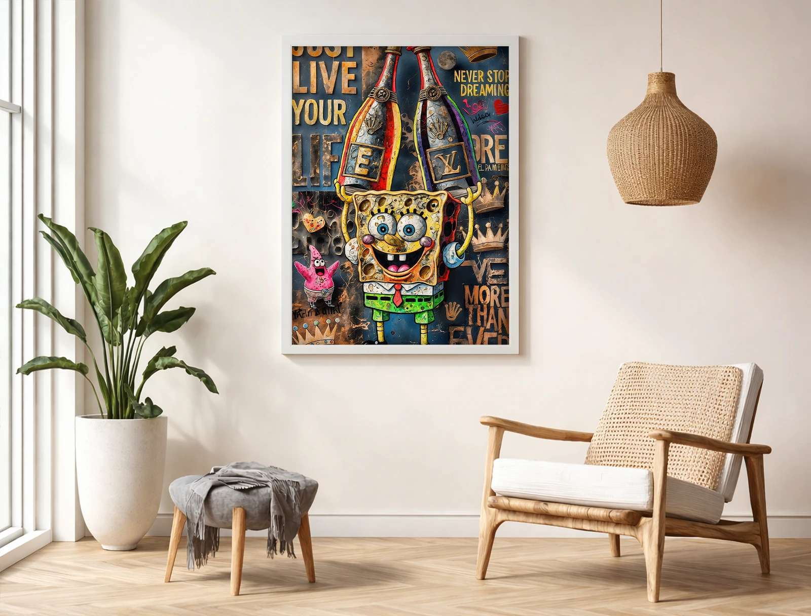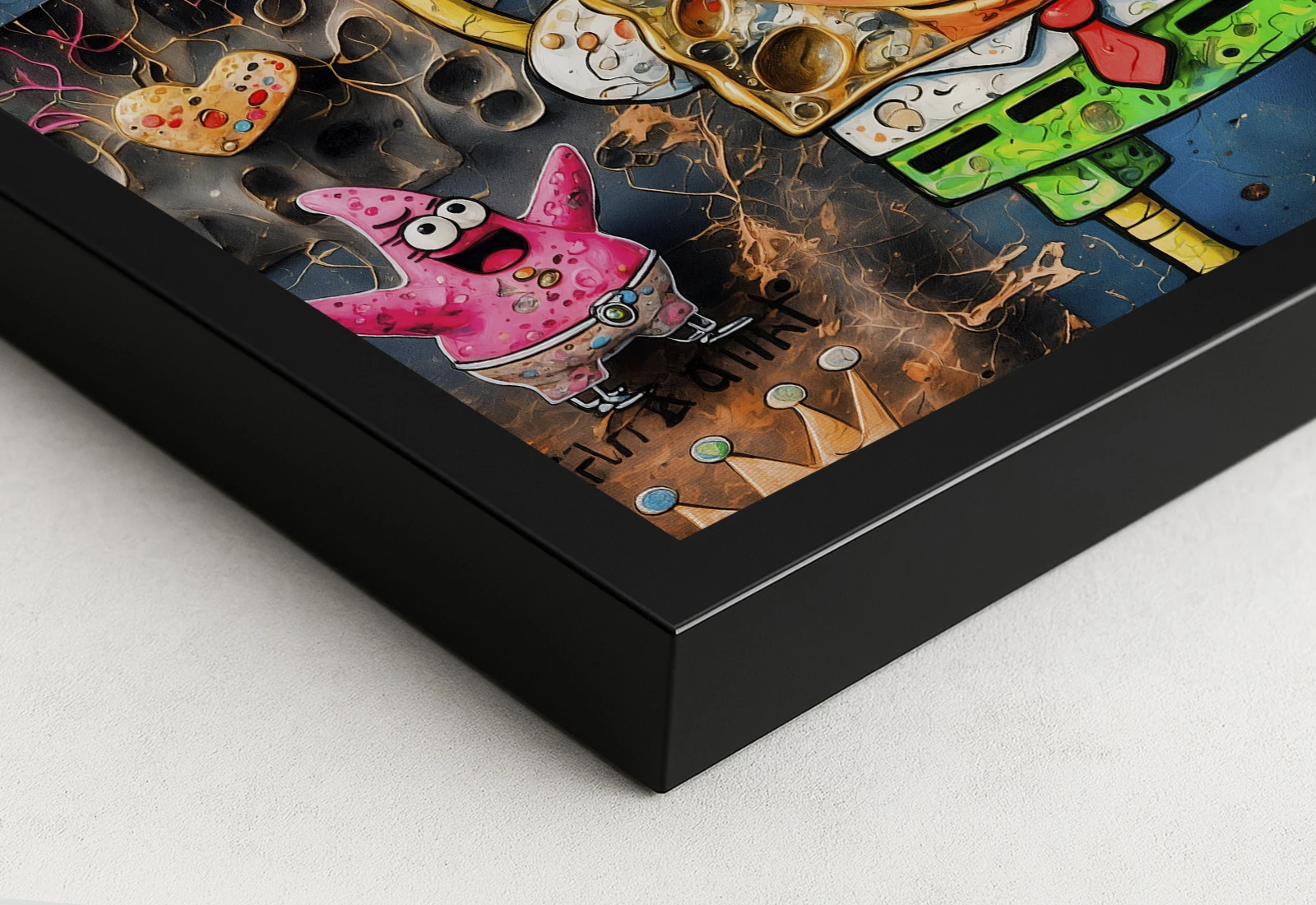 ✅ Картина на холсте с Губкой Бобом и шампанским. ✓ Яркие оттенки, детализированный персонаж и граффити с текстом. 🚚 Доставка по Кишинёву. ⭐ Art-Design.md